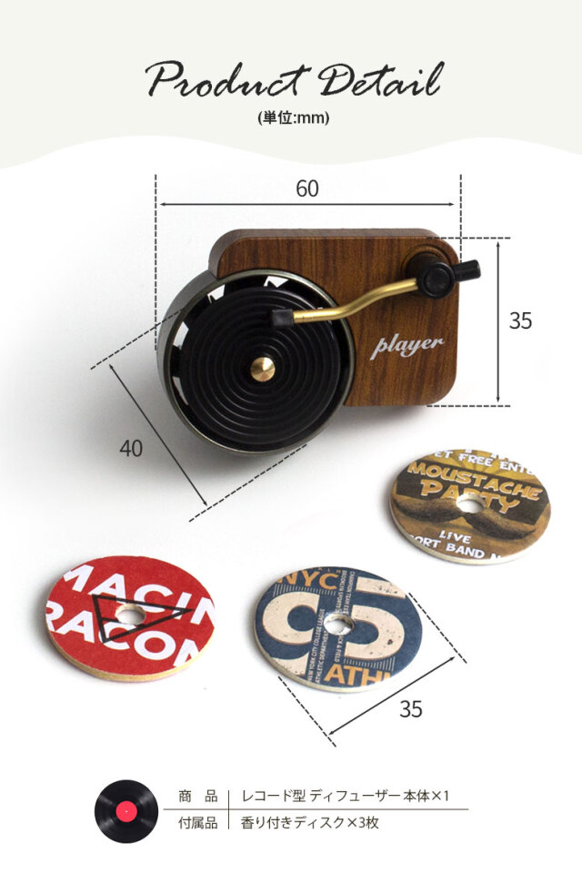| 製品名: | レコード型 ディフューザー 車内 芳香剤 香り付きディスク3枚つき |