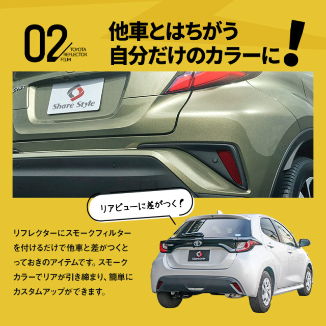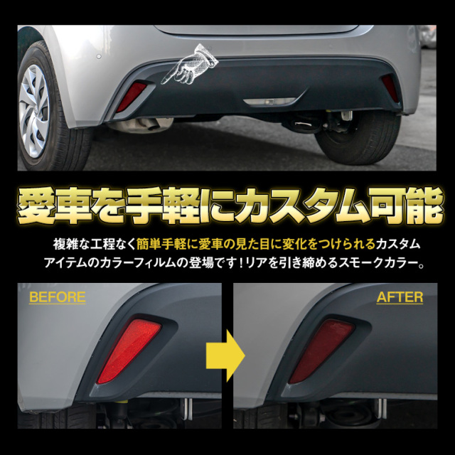TOYOTAヤリス/C-HRのリフレクターの形状にカット済みのスモークフィルムです。貼るだけでリフレクターを目立たなくさせリアビュー全体を引き締まった印象に変えてくれるアイテムです。 [ 材質 ] PU [ セット内容 ] スモークフィルム1枚(リフレクター左右2か所分カット済み) [適合車種]C-HR ZYX10/NGX50、ヤリス MXPA15 KSP210 MXPH10など
