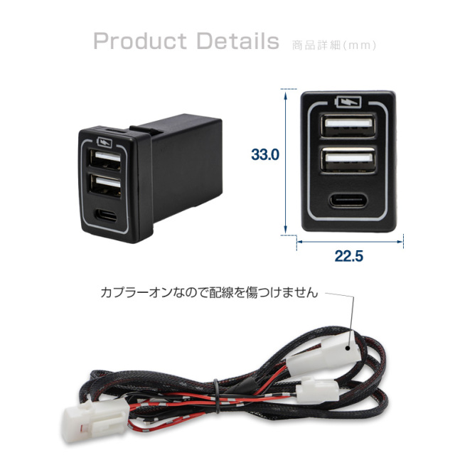 | トヨタ、ダイハツ 車専用 USB QC3.0 PD3.0 対応 急速充電 3ポート 増設キット | |