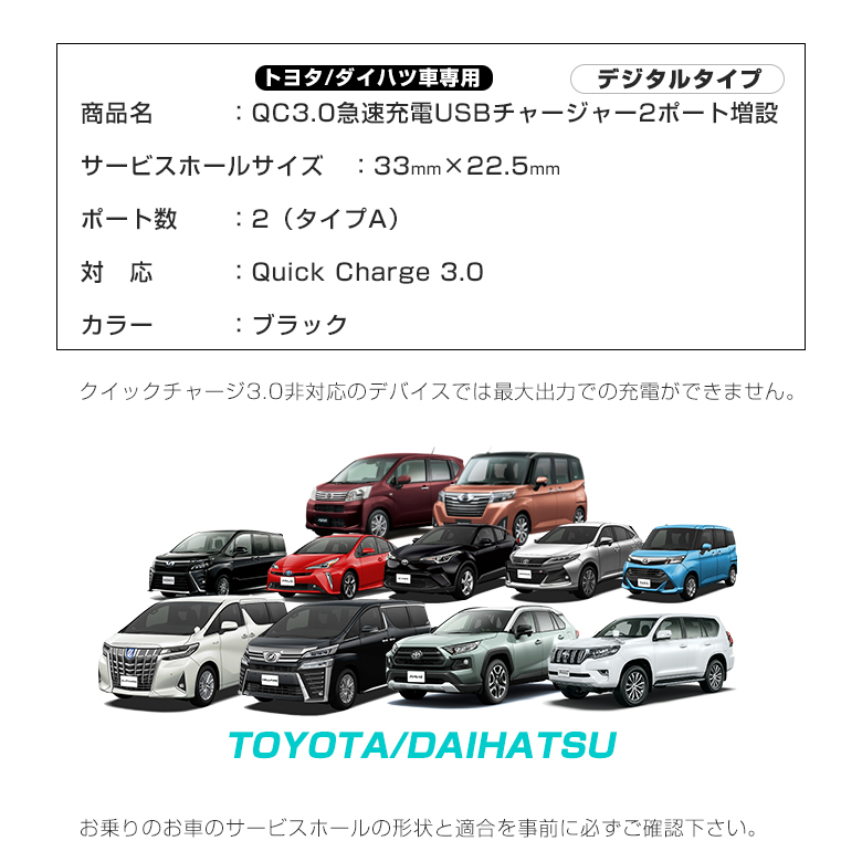 トヨタ、ダイハツ 車専用 デジタル USB Q.C3.0 対応 急速充電 2ポート 増設キット [ 車種専用設計 ] トヨタ、ダイハツの多車種に適合!33×22.5mmのスイッチパネル サービスホールにジャストフィットのUSBポートです [ 急速充電 ] Quick Charge 3.0対応であらゆるデバイスのUSB充電に最適!様々なデバイスをフルスピードで急速充電します [ビルトイン] ジャストサイズで純正のようなフィット感 [ ポート数 ] 2(タイプA) ■適合車種 33mm×22.5mmのスイッチパネル サービスホールのあるお車