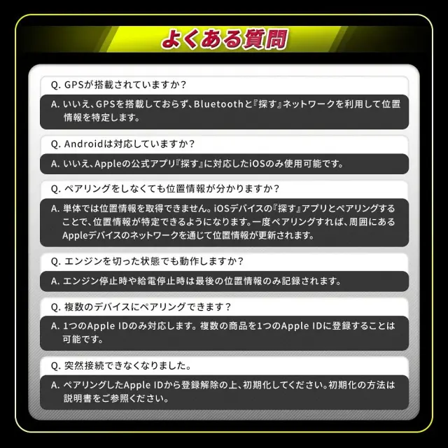 ※iOSデバイスのみ使用可能です。Appleの『探す』アプリを利用して位置情報を特定します。 ※単独では位置情報を特定できず、近くのiOSデバイスを通じて位置情報が更新されます。 ※ペアリングは1つのApple IDのみ対応します。複数の商品を1つのApple IDに登録することは可能です。 ※ペアリング後はエンジンON時にビープ音が鳴ります。 ※エンジンを停止すると位置情報の更新が停止します。 ※立体駐車場などの階数は特定できません。 ※iOSのアップデートなどにより、画面表示や操作手順が説明書と異なる場合がございます。 ※突然接続できなくなったら、Apple IDへの接続を解除してから初期化してください。 ※ビープ音はデバイスの接続状況(接続中/未接続)によって異なります。 ※QC3.0、PD3.0 非認証のデバイスでは最大出力での充電ができません。 ※ポートを同時に利用した際、充電時間が長くなる場合がございます。 ※グレード・追加オプション・エアロパーツ・社外品等を装着している車によっては形状が合わない場合があります。お乗りのお車と商品画像を見比べて合うことをご確認の上、ご購入をお願いいたします。 ※車両適合情報は本製品発売時のものになります。その後の車両側の仕様変更や改修によっては正常に動作/適合しない場合がありますのでご注意ください。 ※取り付けの際の工賃等の請求は一切受け付けません。 ※お取り付けは、自己責任にて、作業を行って下さい。お客様責任による破損での対応は受付できません。 ※必ずフィッティング確認を行ってから取り付けてください。 ※社外品につき小傷等がある場合がございますが、使用に支障がない限り交換、返品はいたしません。 ※本製品を使用したことによる直接、間接的に生じた事故、損害、破損についての責任は弊社は一切負いません。 ※モニターの環境により商品の色合いや素材感などが異なる場合がございます。 ※商品は予告なく仕様変更もしくは販売終了している場合がございますのであらかじめご了承ください。 ※国外への配送はEMSでの発送です。ご注文後、弊社よりメールにて別途送料などをお知らせいたします。 |