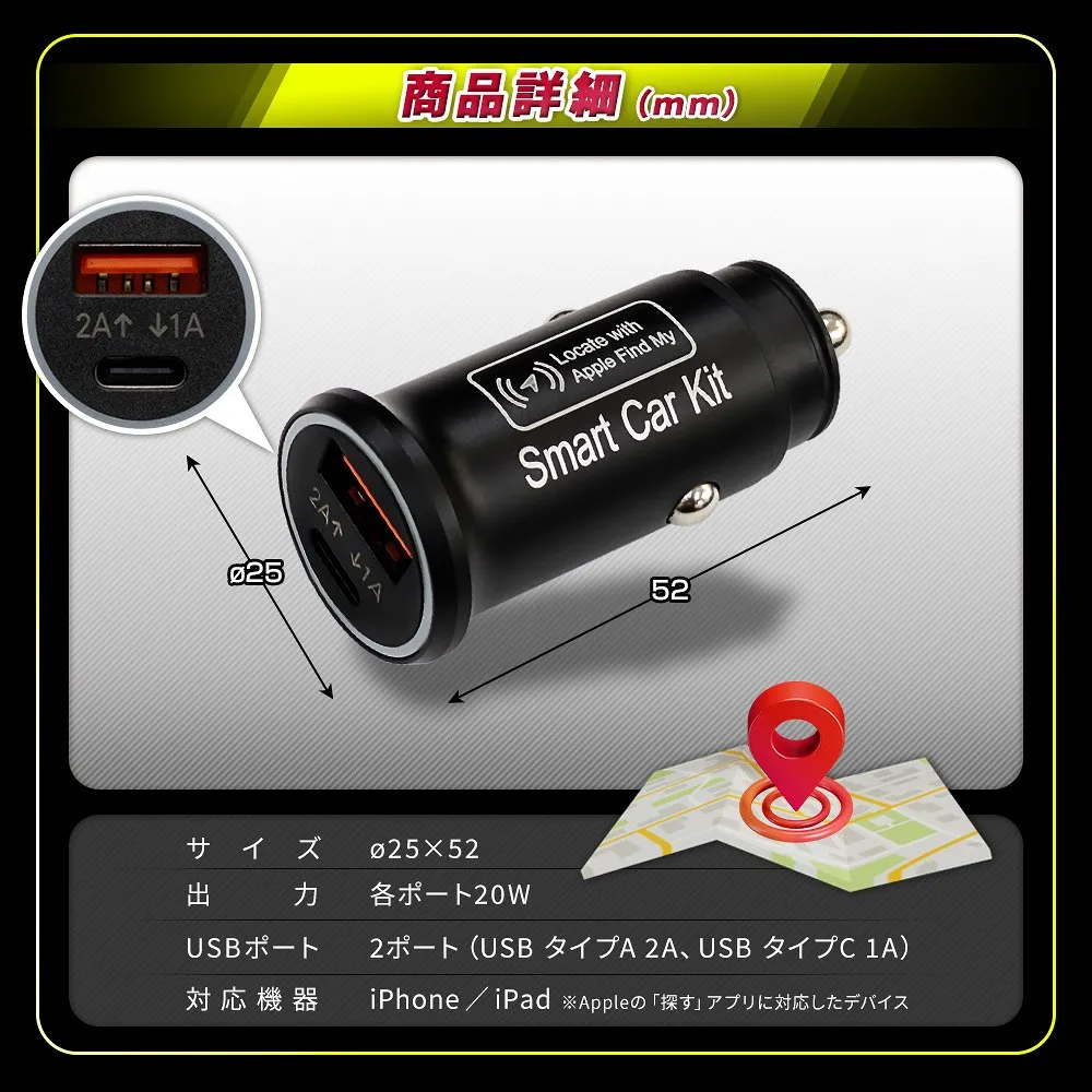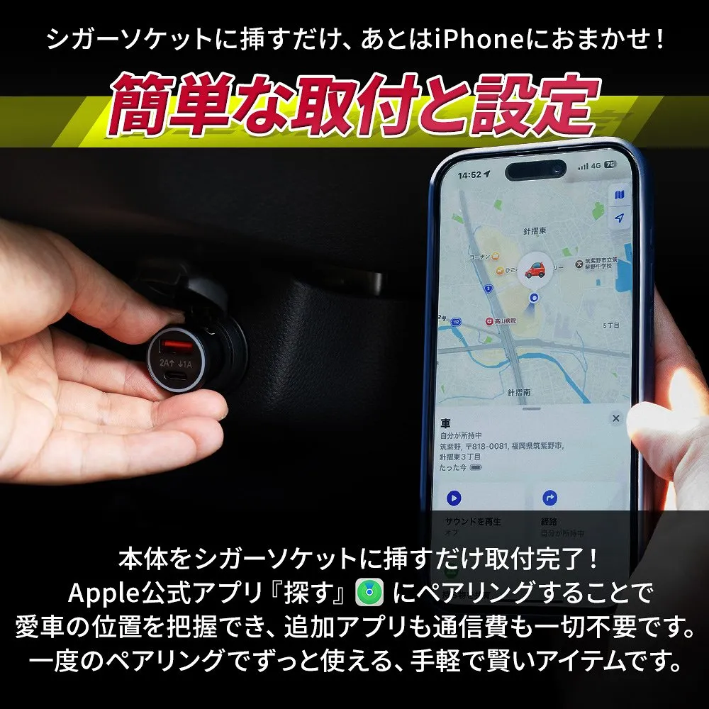 | 製品名: | 汎用 iOS連携 ロケーターチャージャー Find My対応 車両位置特定&同時充電 USB-A/C急速充電器 |