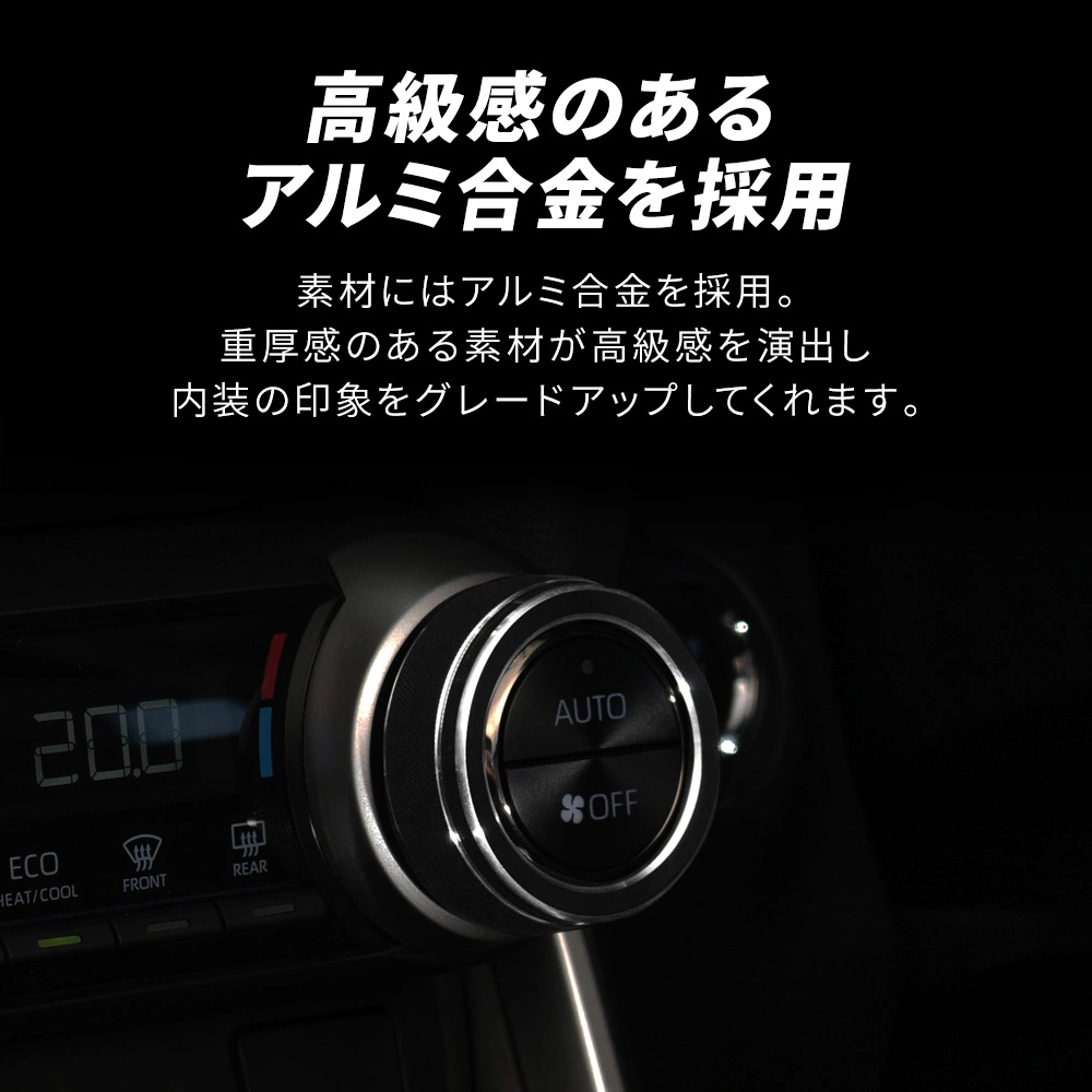 エアコンダイヤルにアクセントを追加!RAV4 50系 専用 エアコンダイヤルリング 2pです。 [材質] アルミ合金 [セット内容] 2p+取扱説明書 [装着方法] 両面テープで簡単装着 ■適合車種 RAV4 50系 ※年式やグレードにより装着できない場合がございます。商品画像とお車をよく見比べたうえでご購入ください。
