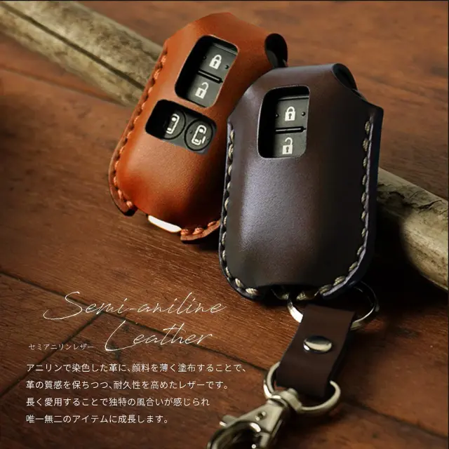 スペーシア スペーシアカスタム スペーシアギア MK53S MK54S MK94S/ソリオ ソリオ バンディットMAD7S MA47S MA37S MA27S/スペーシアベース MK33V/ワゴンRスマイル MX81S MX91S などのスズキ車のために特別に設計された本革製のアクセサリーです。高品質なレザーを使用し、耐久性と美しさを兼ね備えています。手に馴染む感触と、使い込むほどに味わいが増す風合いが魅力です。リレーアタックには対応していませんが、スタイリッシュなデザインで愛車のキーをしっかりと保護します。