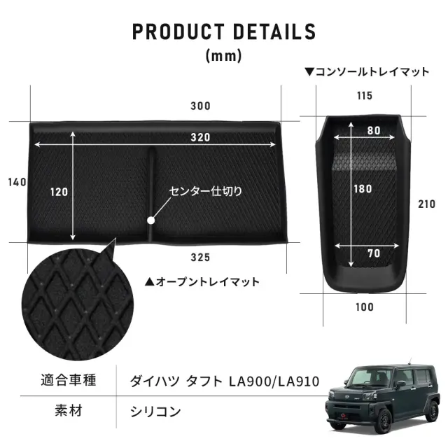 シリコン製でお手入れ簡単 カタカタ音軽減 3D設計 タフト LA900 LA910 オープントレイカバーです。   [ 材質 ] シリコン [ カラー ] ブラック [ セット内容 ] センターコンソールマット1p / オープントレイマット1p [ 装着方法 ] 被せるだけの簡単装着   ■適合車種 タフト LA9#0S R2.6~