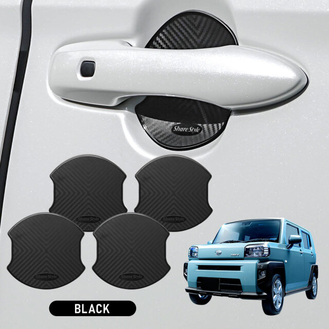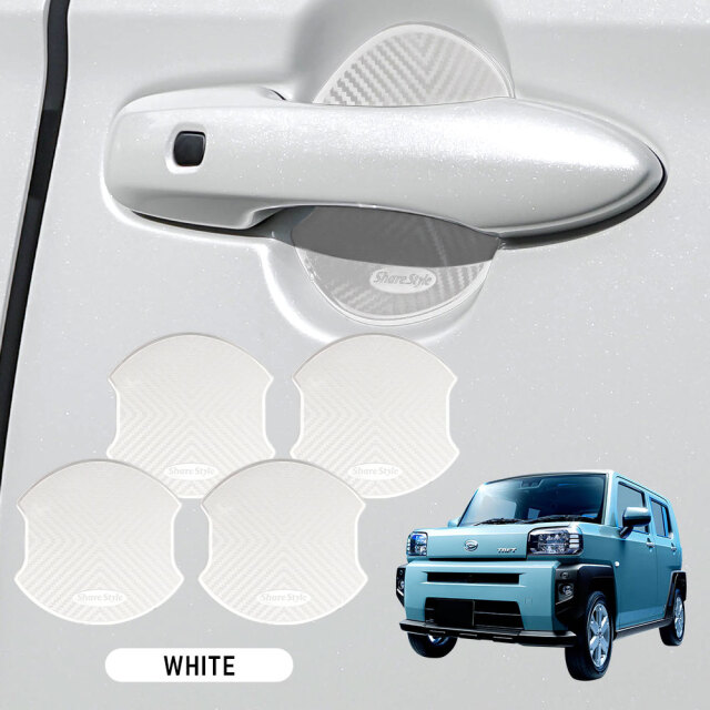 ドアノブを爪キズから守りドレスアップ効果も抜群! タフト 対応 ラバードアプロテクター 4p です。 [ 材質 ] TPU [ カラー ] ブラック/ホワイト [ セット内容 ] 4p+粘着促進剤+取扱説明書 [ 装着方法 ] 裏面強力両面テープで貼り付け ■適合車種 タフト LA9#0S R2.6~