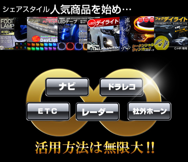 | ヴェルファイア30系 前期 / 後期 / アルファード30系 前期 / 後期 / C-HR (ZYX10・NGX50) ノア80系 前期 / 後期 / ヴォクシー80系 前期 / 後期 / エスクァイア80系 ※純正でコーナーセンサー/コーナーポールが装着されておりますと、使用できません。 | |