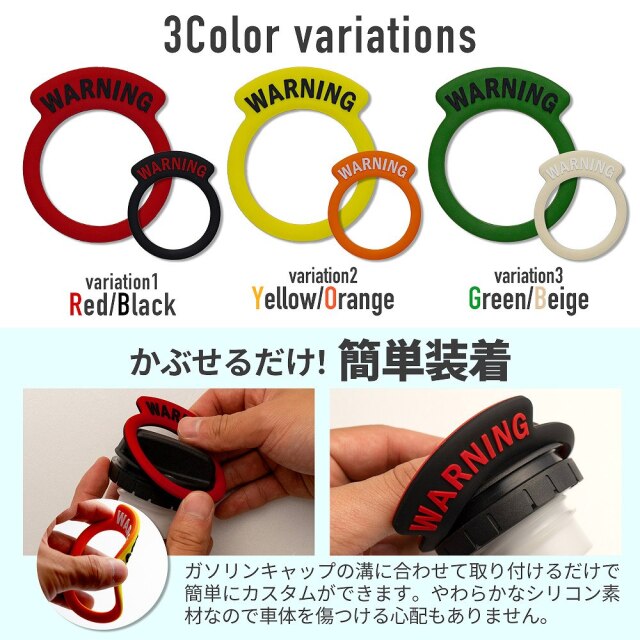 簡単取り付けでさりげないドレスアップ 汎用 ダブルカラー ガソリンキャップリング 1p 2色コンビ 選べる3パターン [ 材質 ] シリコン [ カラー ] イエロー/オレンジ、レッド/ブラック、グリーン/ベージュ [ セット内容 ] 1p [ 装着方法 ] 被せるだけの簡単設置 ■適合車種 汎用 ※商品とお車のガソリンキャップのサイズをご確認ください。 ※商品の製造上小さな黒い点が稀に入っている場合がございますがご了承ください。