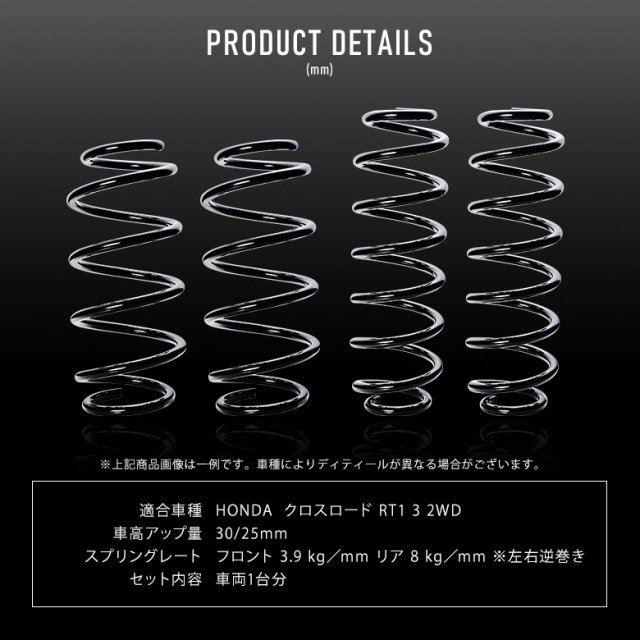 リフトアップでアクティブな車両にカスタマイズできるリフトアップスプリングです。 [ 材質 ]SUP9/SAE9254 [ 車高アップ量 ] 30/25mm [ スプリングレート ]フロント 3.9 kg/mm リア 8 kg/mm ※左右逆巻き [ 適合車種 ]クロスロード RT1 3 2WD