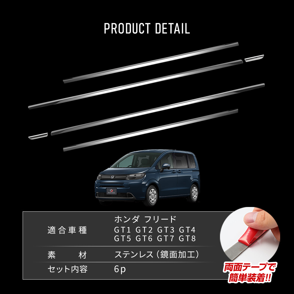 貼るだけ簡単取り付けで愛車をドレスアップ フリード GT ウィンドウモール 6pです。 [ 材質 ] ステンレス(鏡面加工) [ カラー ] シルバー [ セット内容 ] 6p+粘着促進剤 [ 装着方法 ] 裏面両面テープ貼り付け ■適合車種 フリード GT1 GT2 GT3 GT4 GT5 GT6 GT7 GT8 R6.6~