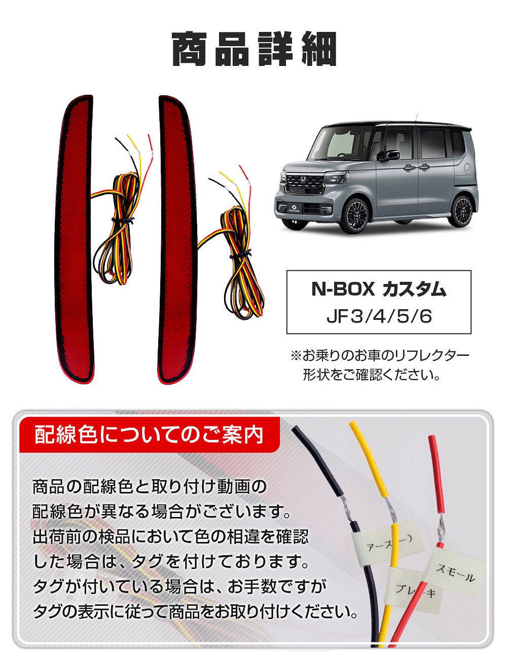 後続車両の視認性アップや愛車のドレスアップに N-BOXカスタム JF3 JF4 JF5 JF6 LEDリフレクター 2p です。 [ 材質 ] LED 合成樹脂 [ カラー ] レッド [ セット内容 ] 2p(左右) + 取扱説明書 [ 装着方法 ] 純正交換 配線接続 ■適合車種 N-BOXカスタム JF3 JF4 H29.8~R2.12 全グレード対応/N-BOXカスタム JF5 JF6 R5.10~ 全グレード対応