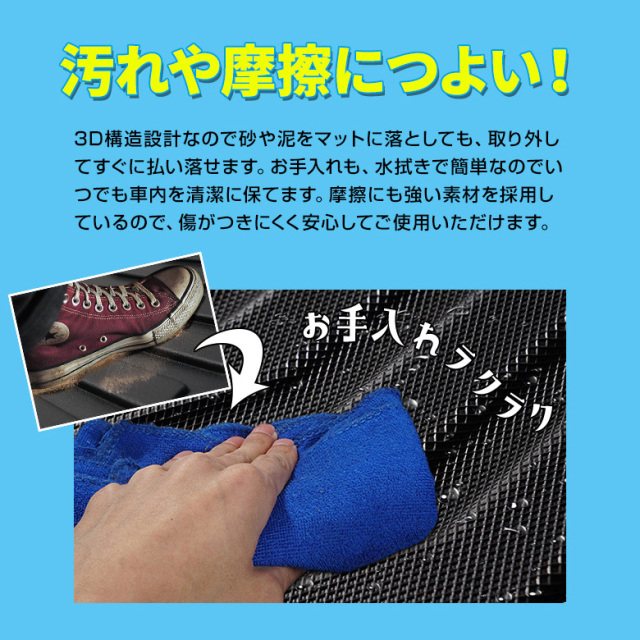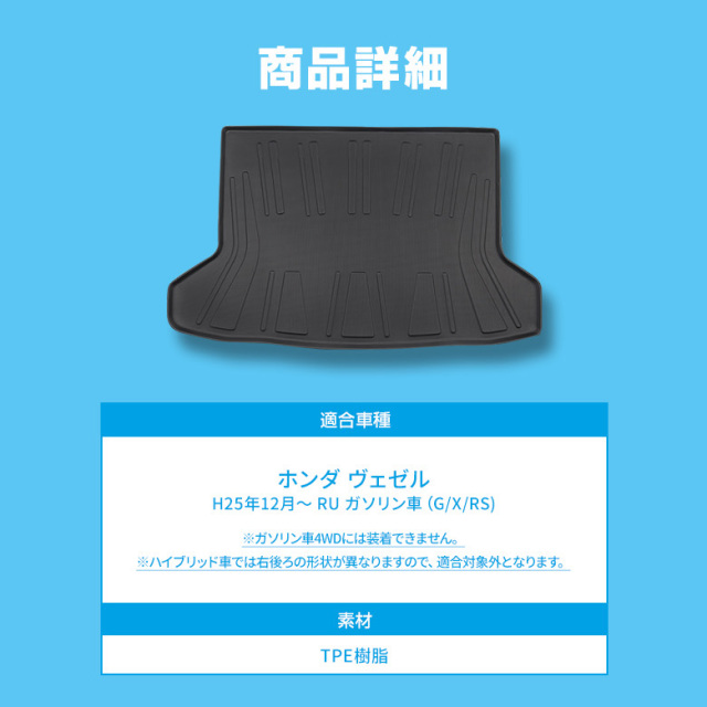 ヴェゼル RU ガソリン車 専用 3Dラゲッジマット [ 商品概要 ] 専用設計でしっかりフィットする、ヴェゼル RU ガソリン車専用 3Dラゲッジマットです。 [ 材質 ] TPE樹脂 [ セット内容 ] ラゲッジマット1P [ 装着方法 ] 置くだけ簡単装着 ■適合車種 ヴェゼル RU ガソリン車(G/X/RS)専用 H25.12~ ※ガソリン車4WDには装着できません。 ※ハイブリッド車では右後ろの形状が異なりますので、適合対象外となります。