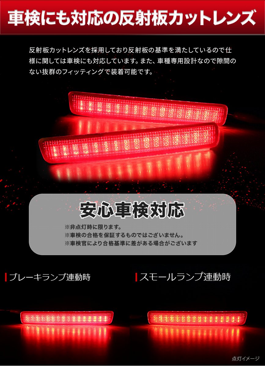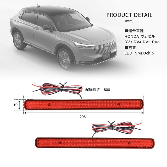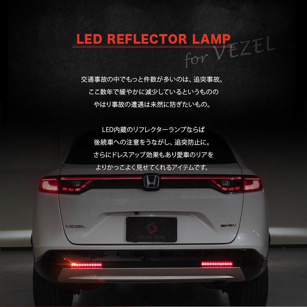 車検対応!LEDで後方にアピール!ヴェゼル RV系 専用 LED リフレクターです。 [ 材質 ] LED [ セット内容 ] 2P(左右)+取扱説明書 [ 配線 ] スモール(白)、ブレーキ(赤)、アース(黒) ■適合車種 ヴェゼル RV系 RV3 RV4 RV5 RV6 (R3.4~)