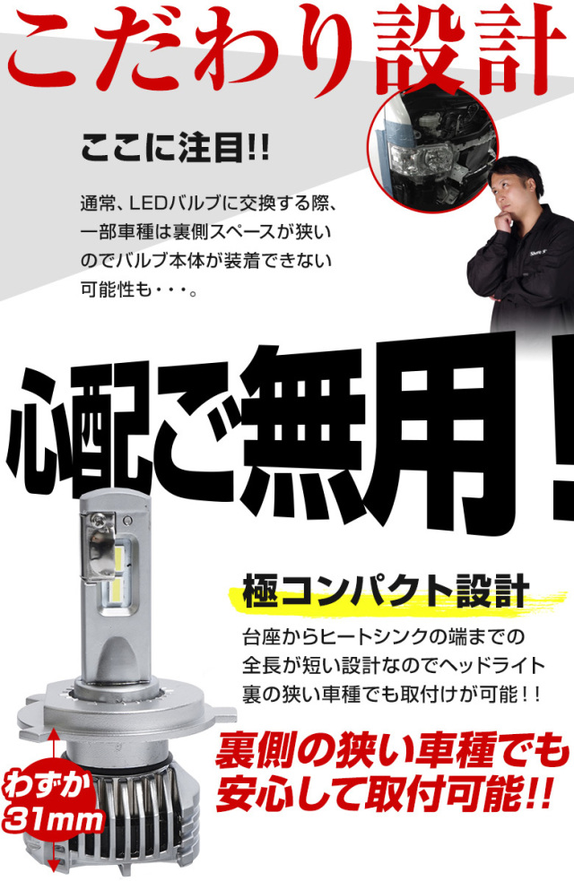 コンパクトで従来の商品より交換作業が簡単!車検対応 1年保証 H4 LED ヘッドライト Z Glanz [ 材質 ] LEDチップ:7035 [ 色温度 ] 6500K [ セット内容 ] 2p [ 装着方法 ] 純正バルブとほぼ同寸のコンパクト設計で、スペースに困らず取り付けが可能。 ■適合車種 汎用 ※H4ハロゲンバルブ車に適合