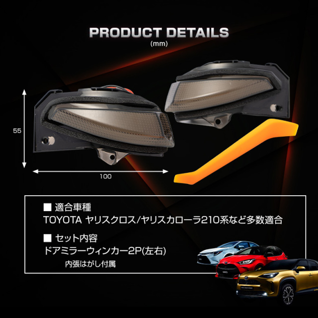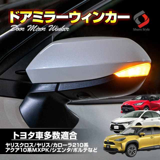 カー用品の事ならシェアスタイル!メッキパーツやルームランプを多数ご用意しております。 本商品は専用TOYOTA汎用ドアミラーシーケンシャルウィンカーです。 [ 商品概要 ] トヨタ車多数適合 シエンタ ヤリス ヤリスクロス カローラ アクア10系 等 ドアミラーシーケンシャルウィンカー トヨタ汎用 [ 材質 ] LED [ セット内容 ] 2P+内張はがし+取扱説明書