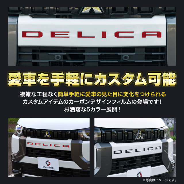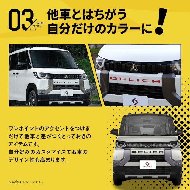 簡単貼り付けで愛車をドレスアップ カット済み デリカミニ フロントエンブレム カーボンステッカーです。 [ 材質 ] PVC [ カラー ] カーボンブラック/カーボンシルバー/カーボンレッド/カーボンピンク/カーボンホワイト [ セット内容 ] 6p [ 装着方法 ] 石鹸水等を使用し位置決め、フィルム表面にヒートガンやドライヤーの熱をあてしっかり貼り付け! ■適合車種 デリカミニ B34A B35A B37A B38A R5.5~R7.9