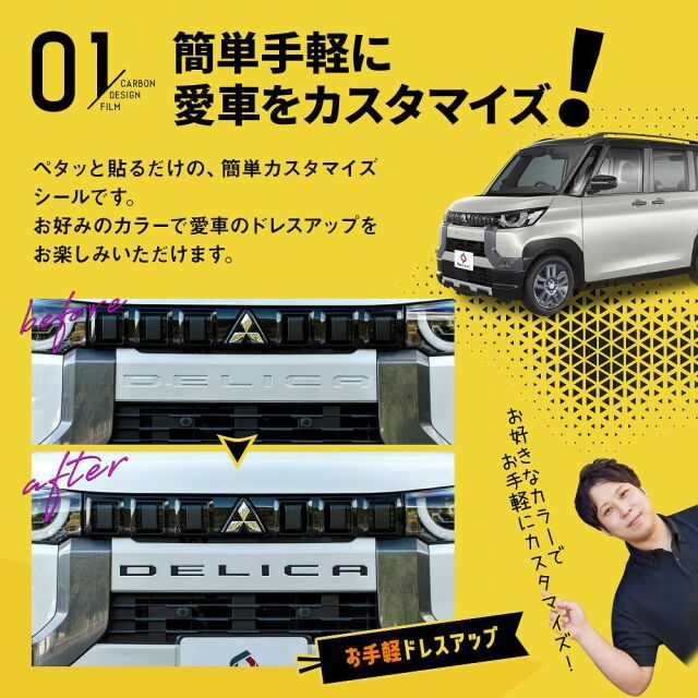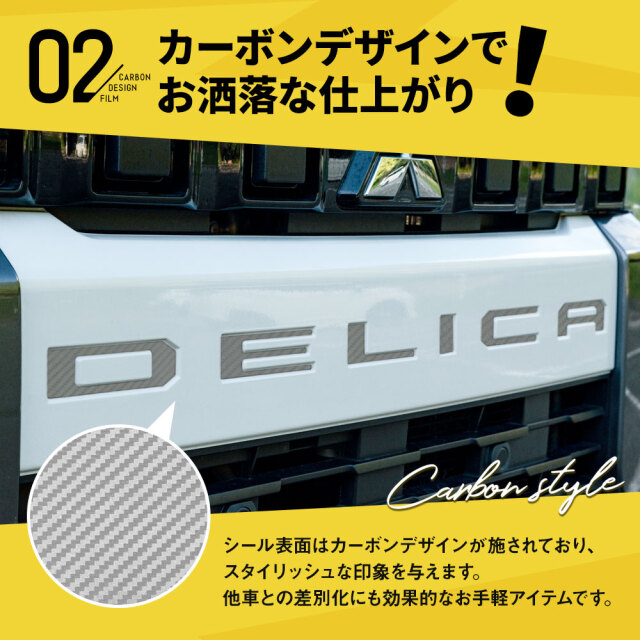 デリカミニ専用のフロントエンブレムカーボンステッカーは、車の印象を一新するための理想的なアクセサリーです。カット済みなので、型取りの手間がなく、簡単に装着できます。カーボン柄が高級感を演出し、ドレスアップやカスタムに最適です。6ピースセットで、細部までこだわったデザインが特徴。おしゃれでスタイリッシュな外観を手軽に実現できるこのステッカーで、愛車を個性的に仕上げましょう。