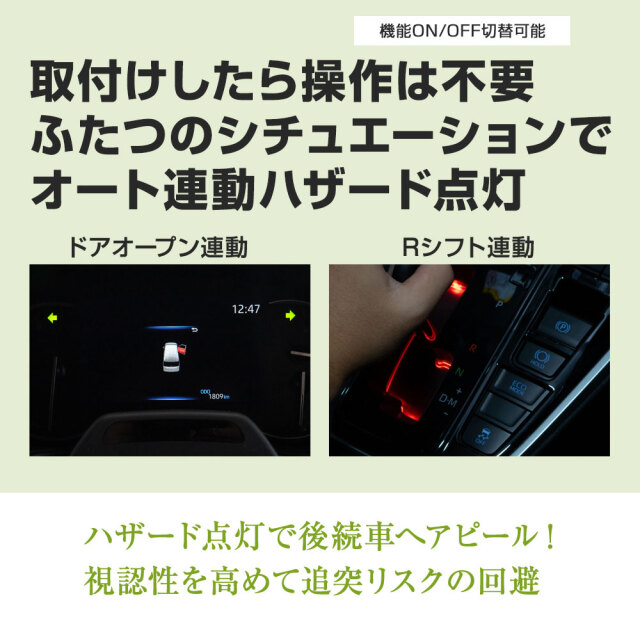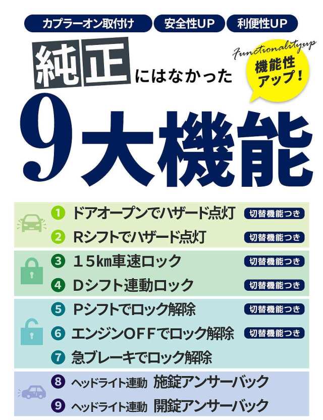 | ※パドルシフト装着車はパドルシフト操作時に予期せぬ動作をする場合がございます。ご注意ください。 ※運転者はすべての機能を熟知したうえで作動させてください。 ※お子さまやペットなどが乗車している場合はくれぐれも安全に気をつけて運転者が作動させてください。 ※一部車種やグレード、お取り付けの社外品との干渉などにより、予期しないトラブルが発生する可能性がございます。 ※ハザード連動機能は純正のハザードの点滅スピードとは異なることがございますが、仕様となりますので機能に問題ございません。 ※ヘッドライト連動アンサーバックはオートライト作動環境時のみ点灯します。日中など明るい場所では作動しません。 ※長時間(車両によって異なりますが約20分程度)車両から離れた際、バッテリー上がり防止制御のため、アンサーバック機能が作動しないケースがあります。 ※グレード・追加オプション・エアロパーツ・社外品等を装着している車によっては形状が合わない場合があります。お乗りのお車と商品画像を見比べて合うことをご確認の上、ご購入をお願いいたします。 ※車両適合情報は本製品発売時のものになります。その後の車両側の仕様変更や改修によっては正常に動作/適合しない場合がありますのでご注意ください。 ※取り付けの際の工賃等の請求は一切受け付けません。 ※お取り付けは、自己責任にて、作業を行って下さい。お客様責任による破損での対応は受付できません。 ※必ずフィッティング確認を行ってから取り付けてください。 ※社外品につき小傷等がある場合がございますが、使用に支障がない限り交換、返品はいたしません。 ※本製品を使用したことによる直接、間接的に生じた事故、損害、破損についての責任は弊社は一切負いません。 ※モニターの環境により商品の色合いや素材感などが異なる場合がございます。 ※商品は予告なく仕様変更もしくは販売終了している場合がございますのであらかじめご了承ください。 ※国外への配送はEMSでの発送です。ご注文後、弊社よりメールにて別途送料などをお知らせいたします。 |