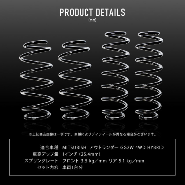 リフトアップでアクティブな車両にカスタマイズできるリフトアップスプリングです。 [ 材質 ]SUP9/SAE9254 [ 車高アップ量 ] 1インチ(25.4mm) [ スプリングレート ]フロント 3.5 kg/mm リア 5.1 kg/mm [ 適合車種 ]アウトランダー GG2W 4WD HYBRID