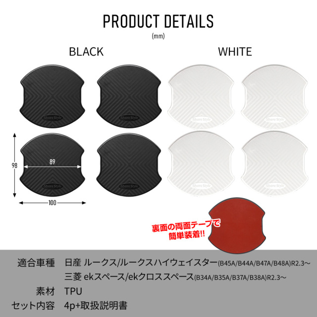 ドアノブを爪キズから守りドレスアップ効果も抜群!日産 ルークス ルークスハイウェイスター B40系 三菱 ekスペース ekクロススペース B30系 対応ラバードアプロテクター 4pです。 [ 材質 ] TPU [ カラー ] ブラック/ホワイト [ セット内容 ] 4p+粘着促進剤+取扱説明書 [ 装着方法 ] 裏面強力両面テープで貼り付け ■適合車種 日産 ルークス/ルークスハイウェイスター(B45A/B44A/B47A/B48A)R2.3~ 三菱 ekスペース/ekクロススペース(B34A/B35A/B37A/B38A)R2.3~