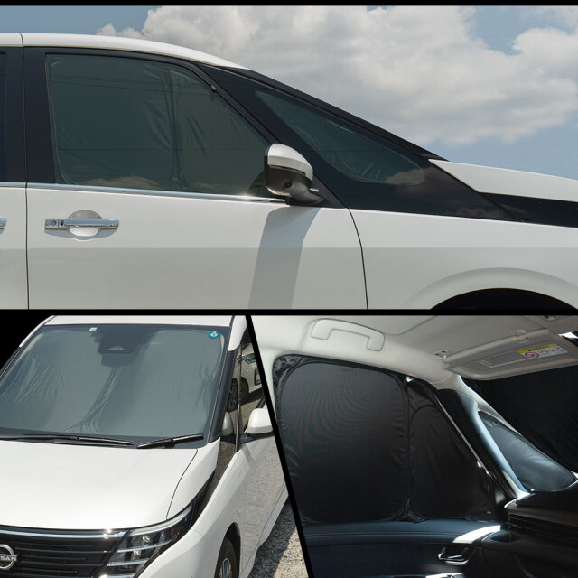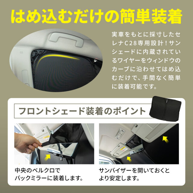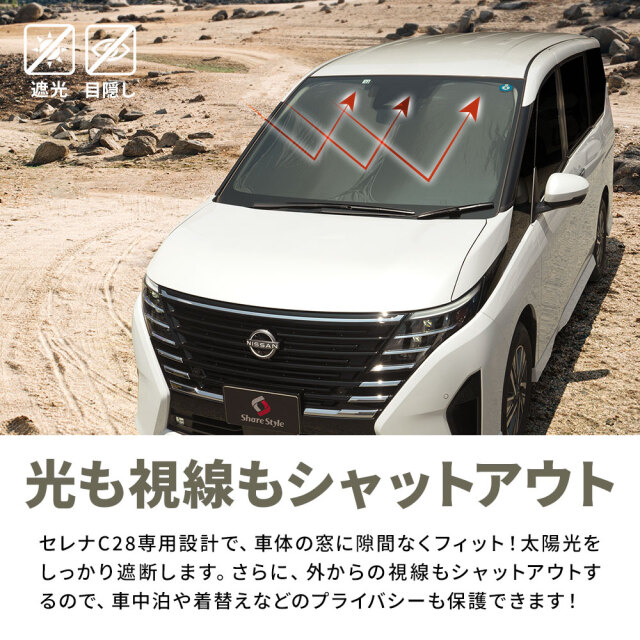 日差しや視線をブロックして車内休憩を快適に。日産セレナC28専用サンシェード 10p [ 材質 ] 190Tポリエステルタフタ素材 [ カラー ] ブラック [ セット内容 ] 本体10P+取付補助パーツ6P+フロントサンシェード用収納袋+取扱説明書 [ 装着方法 ] ウィンドウにはめ込むだけの簡単装着 ■適合車種 日産 セレナ C28 R4.12~