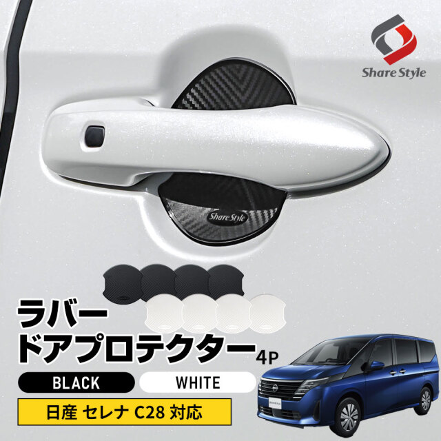 ドアノブを爪キズから守りドレスアップ効果も抜群!セレナ C28 対応ラバードアプロテクターです。 [ 材質 ] TPU [ カラー ] ブラック/ホワイト [ セット内容 ] 4p+粘着促進剤+取扱説明書 [ 装着方法 ] 裏面強力両面テープで貼り付け ■適合車種 日産 セレナ C28 R4.12~