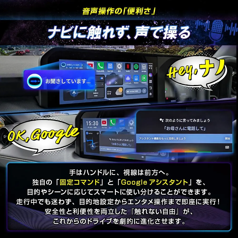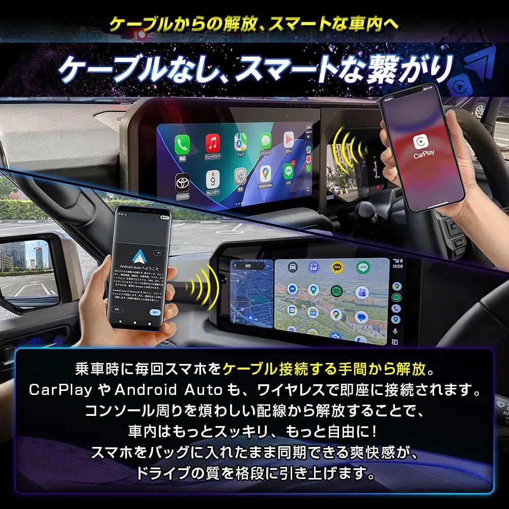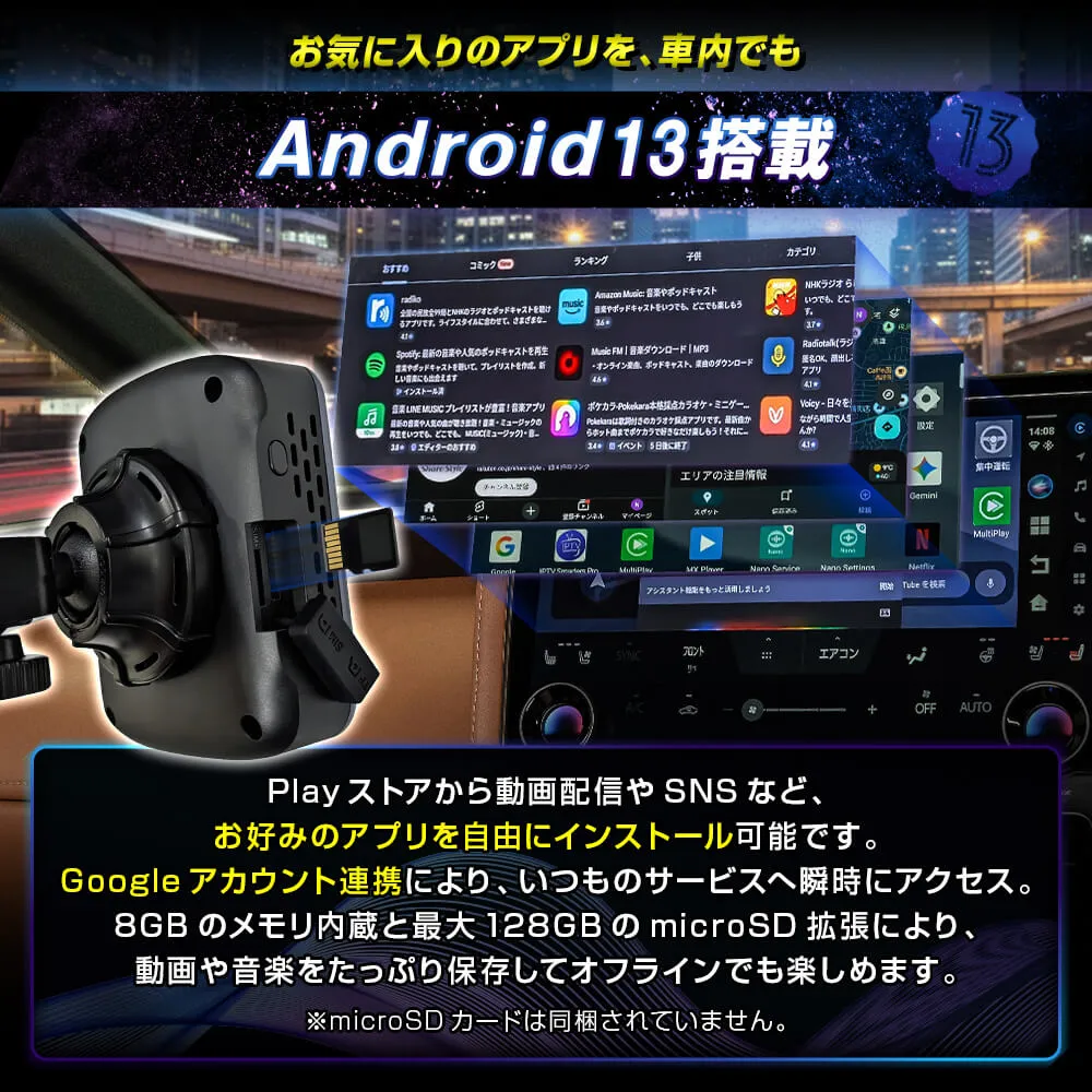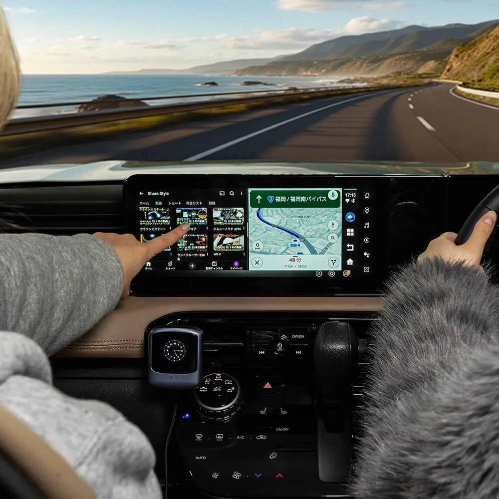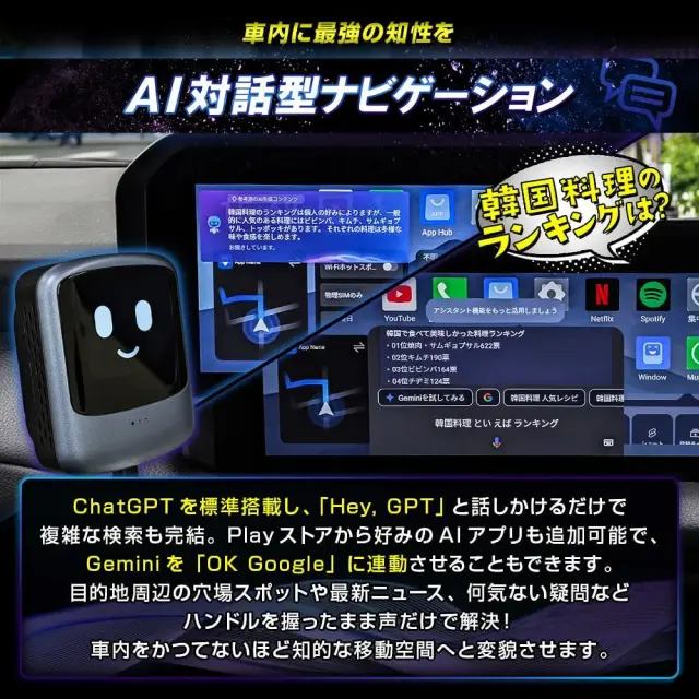 CarPlay搭載車用のAI BOX miniは、ナビをアンドロイド化し、よりスマートなドライブ体験を提供する車載用アダプターです。音声操作やAIアシスタントにより、運転中でも安全に操作が可能。ワイヤレスCarPlayやAndroid Auto、iPhoneに対応し、nano SIMやクラウドSIMを利用して常にネット環境を維持できます。ChatGPTやGemini、Google Playストアの活用に加え、便利な2画面分割表示にも対応。GPSやBluetooth、microSDによる動画再生もサポートし、ナビキャンセラー不要でスムーズな操作を実現します。