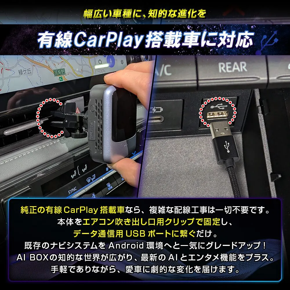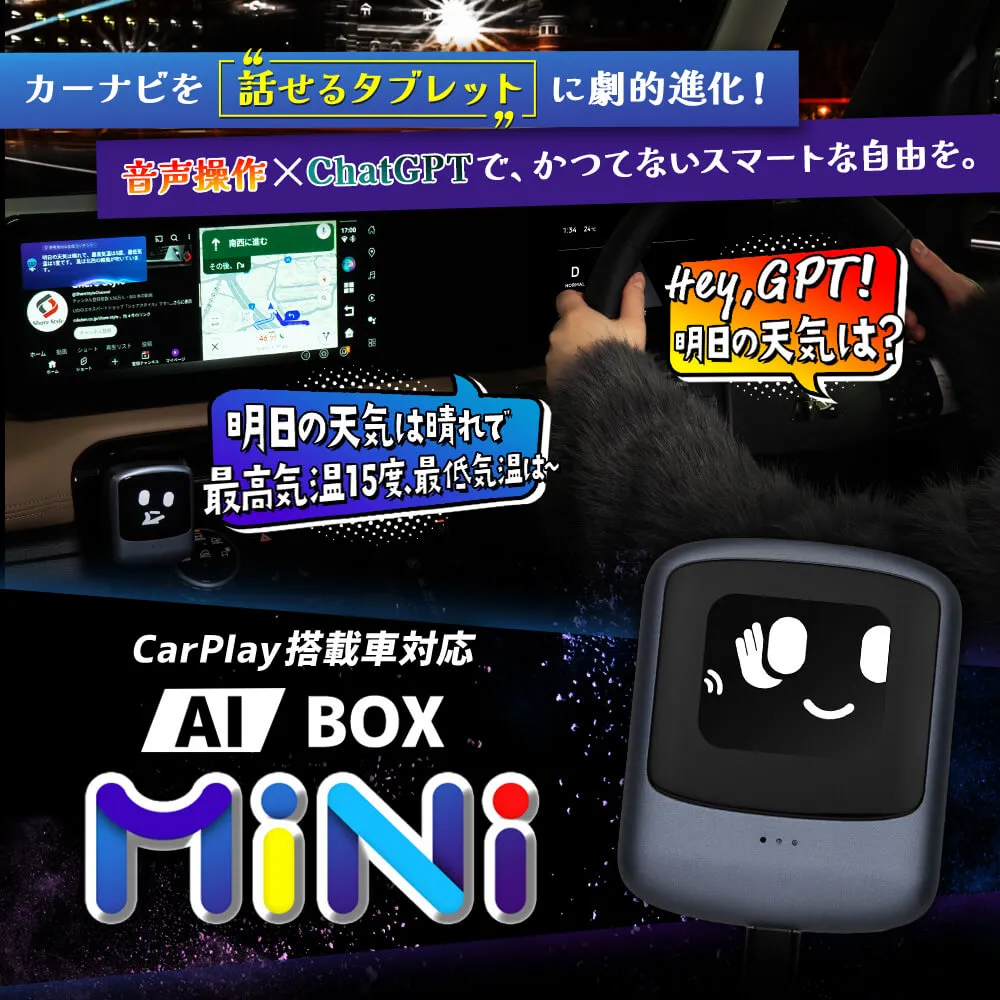 高性能AI BOXで車内エンタメと操作を音声化! CarPlay搭載車 アンドロイド AI BOX miniです。 [ 材質 ] ABS、アクリル [ カラー ] グレー [ セット内容 ] 本体 1p、ボールジョイントクリップ(エアコン吹き出し口用)1p、USBケーブル 2p(Type-A to A 給電用二股ケーブル、Type-A to C)、変更アダプター 1p(Type-A to C)、ケーブルクランプ 4p、取扱説明書(日本語)、AI音声アシスト使用ガイド(日本語&英語) [ 装着方法 ] USBケーブルで接続するだけ ■適合車種 スマートフォンを純正ケーブルで有線接続し、iPhoneではCarPlay、AndroidではAndroid Autoが起動する車両 ■対応車両(例) スペーシア、スペーシアカスタム、スペーシアギア、デリカミニBA系、アクアMXPK10系、ルークスBB系、ノア90系、ヴォクシー90系、アルファード40系、ヴェルファイア40系、ランドクルーザー250、クラウンエステート、オデッセイ アブソルート など