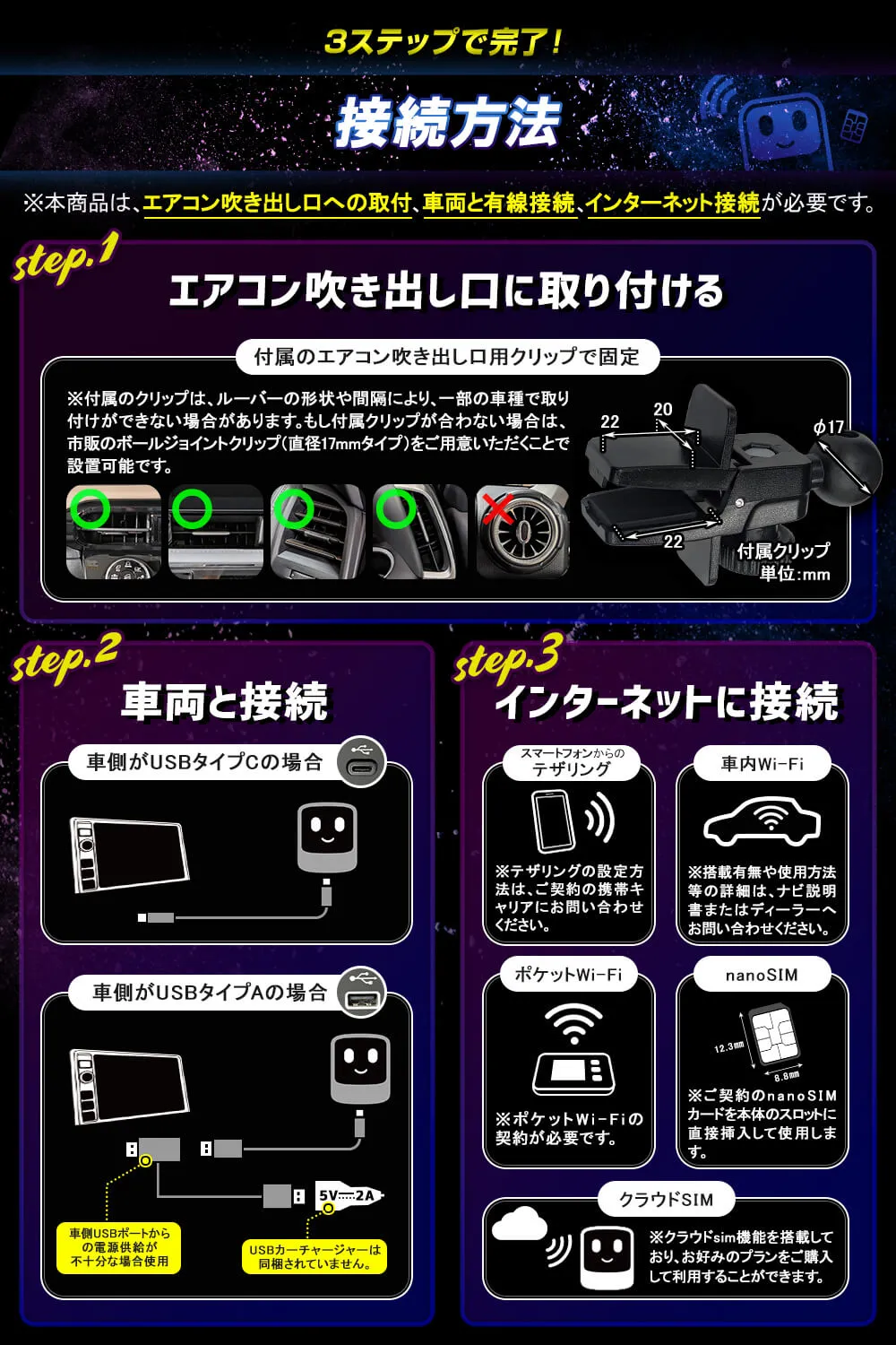 - USBカーチャージャーは含まれていません。お客様ご自身での準備が必要です。