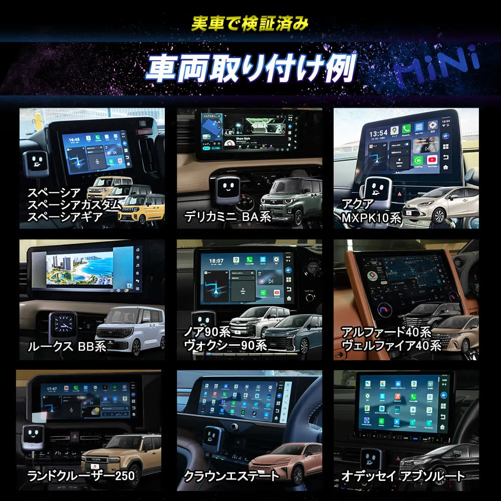 | スペーシア、スペーシアカスタム、スペーシアギア、デリカミニBA系、アクアMXPK10系、ルークスBB系、ノア90系、ヴォクシー90系、アルファード40系、ヴェルファイア40系、ランドクルーザー250、クラウンエステート、オデッセイ アブソルート など |