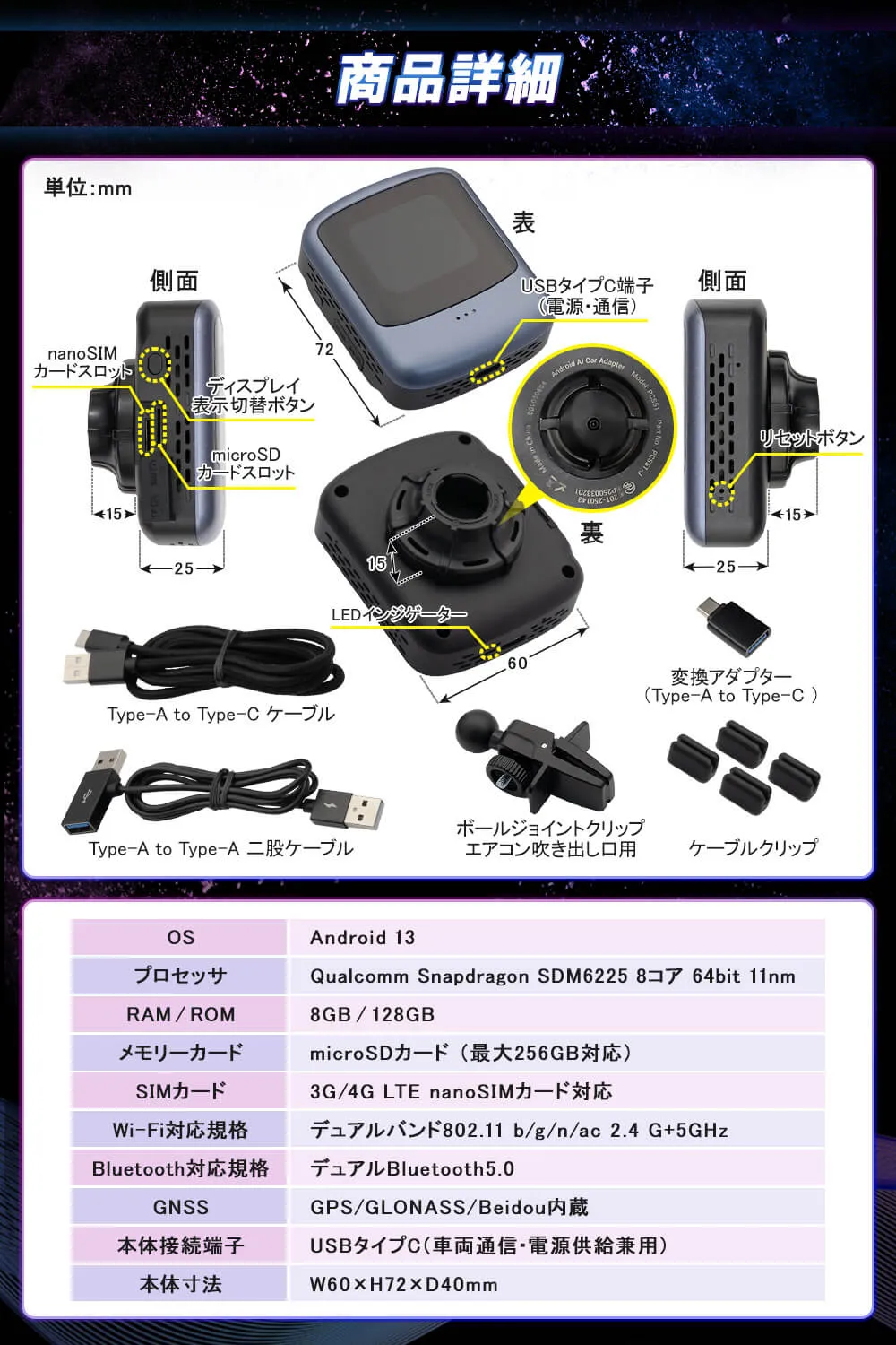 | 本体 1p、ボールジョイントクリップ(エアコン吹き出し口用)1p、USBケーブル 2p(Type-A to A 給電用二股ケーブル、Type-A to C)、変更アダプター 1p(Type-A to C)、ケーブルクランプ 4p、取扱説明書(日本語)、AI音声アシスト使用ガイド(日本語&英語) |