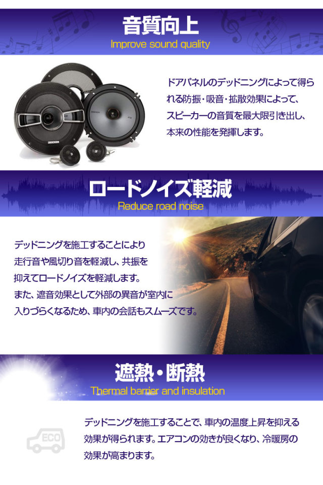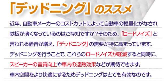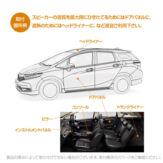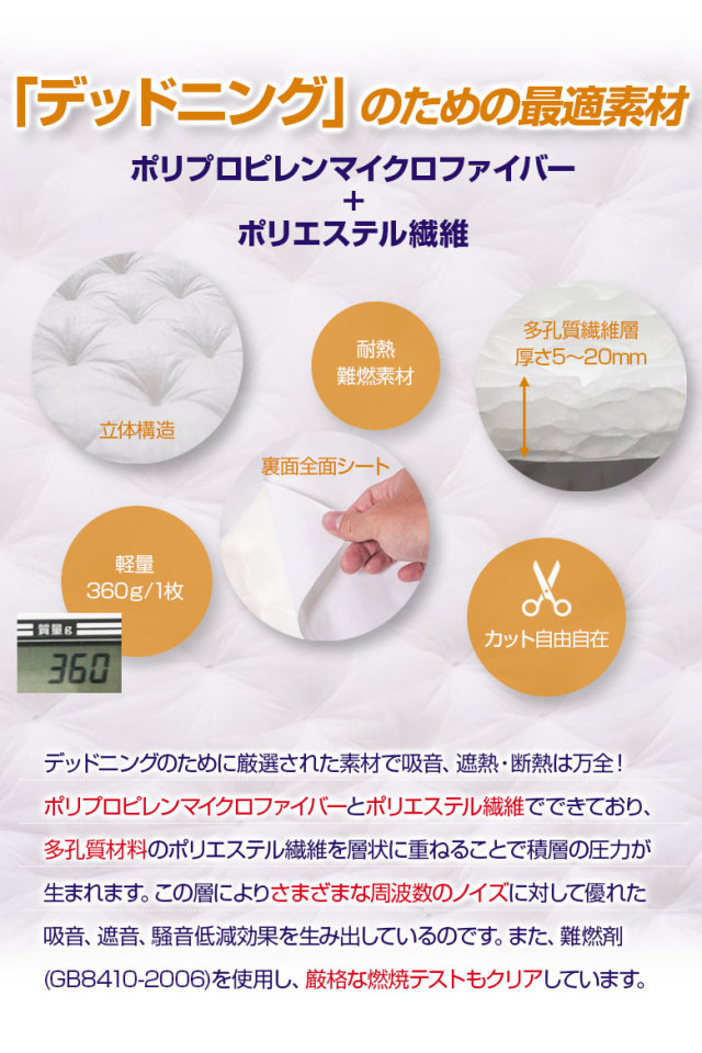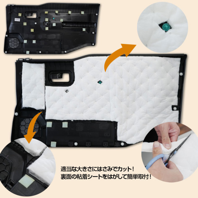 \お得な6枚分セット!/ 裏面全面粘着吸音シート 100cm×50cm 6枚分セット [ 商品説明 ] 車内のビビリ音対策 デッドニング施工 吸音シート [ 材質 ] ポリプロピレンマイクロファイバー、ポリエステル繊維 [ セット内容 ] 6枚分 ※商品カットなし/カット済みをお選びいただけます。 [ 簡単取付 ] 裏面は全面粘着シート ハサミでお好きな形状に切って貼るだけ! ■適合車種 汎用