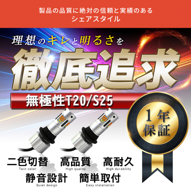 カー用品の事ならシェアスタイル!メッキパーツやルームランプを多数ご用意しております。 本商品は汎用2色切替可能 ハイフラ抵抗内蔵 ウインカーランプです。 ハイフラ防止機能を内蔵してるので、そのままウィンカーにお取り付けできます。 デイライト機能付きで配線をつなげばデイライトとしても使用可能です。