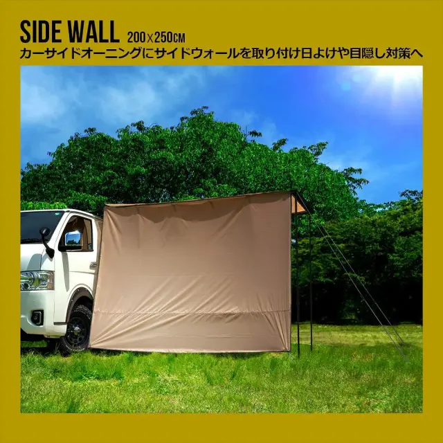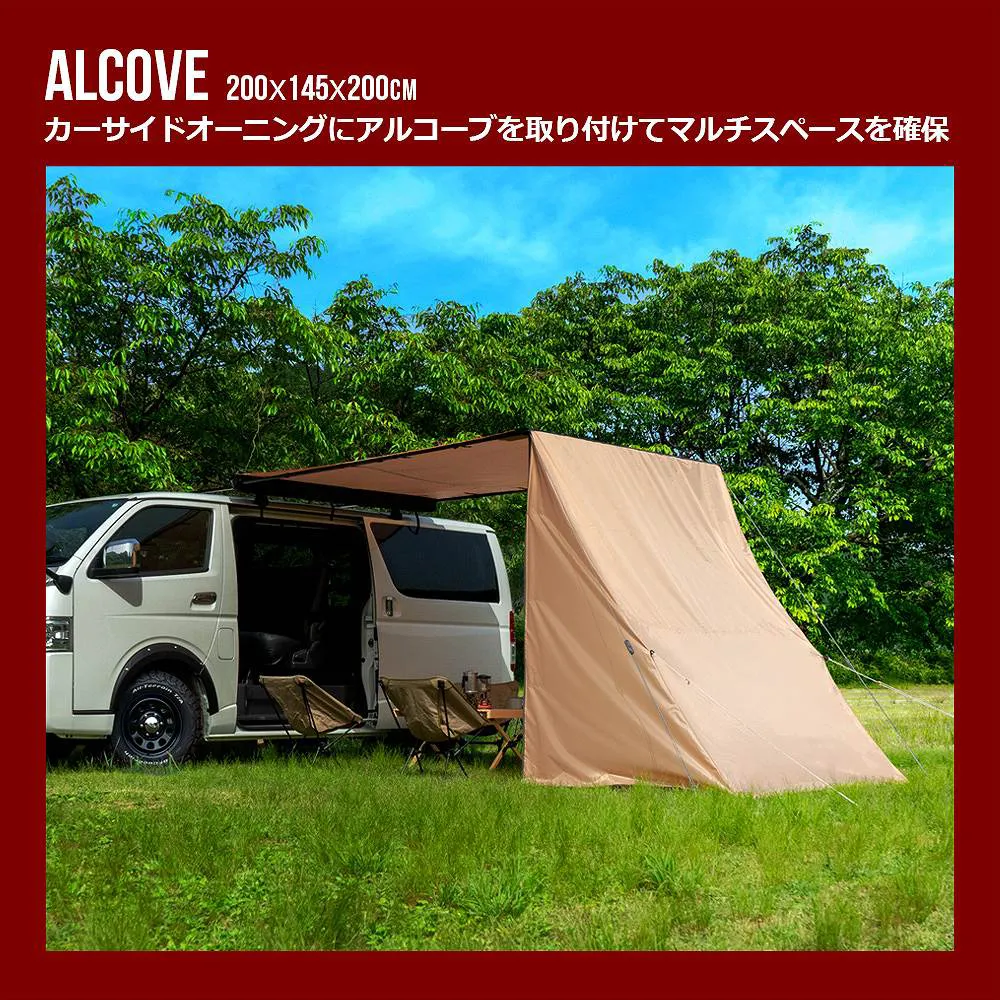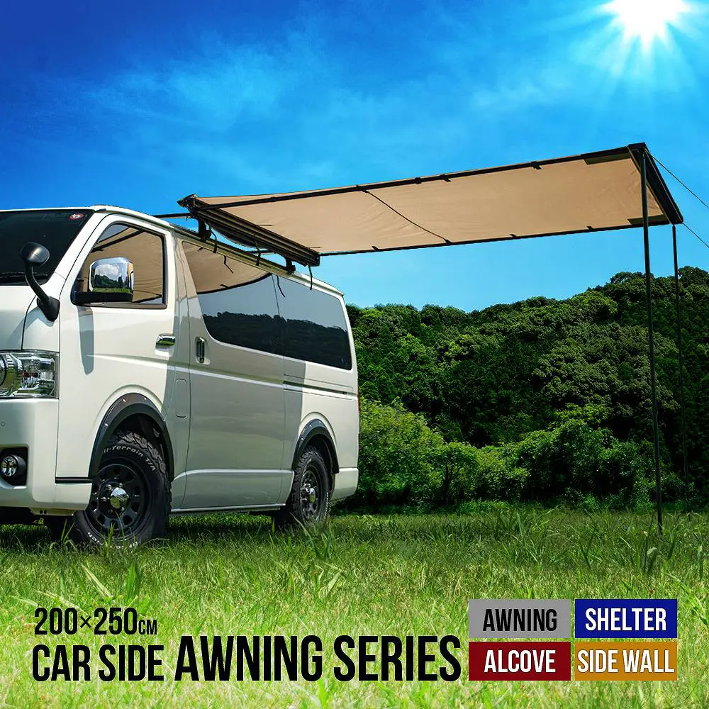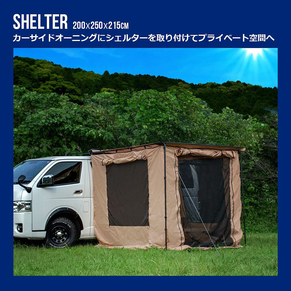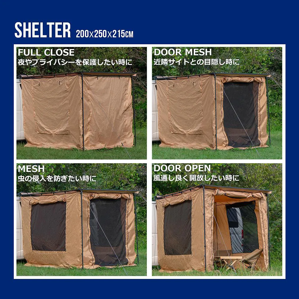 簡単組み立て、簡単収納のカーサイドオーニング ロールアップ 収納型 カーサイドオーニング/シェルター/アルコーブ/サイドウォールです。 [ 材質 ] 生地:420 Dオックスフォードポリエステル [ 使用サイズ ] オーニング:(約)幅200×奥行250× 高さ125-220 (cm) シェルター:(約)幅190×奥行240× 高さ215 (cm) アルコーブ:(約)幅145×奥行200×高さ200(cm) サイドウォール:(約)幅200×高さ250(cm) [ カラー ] サンド