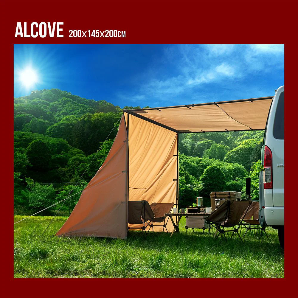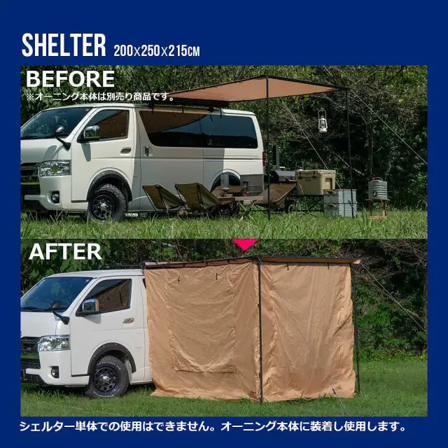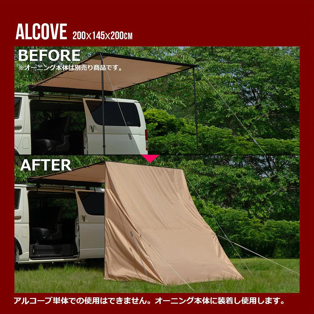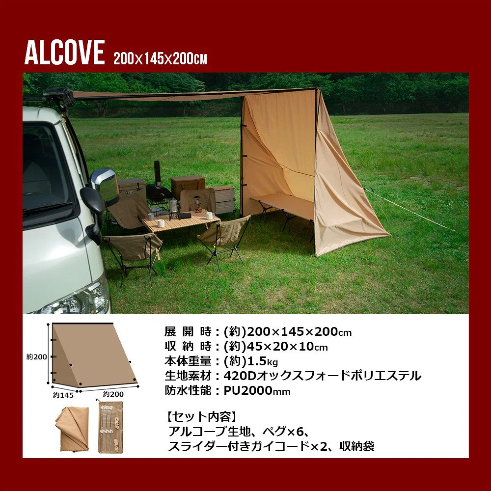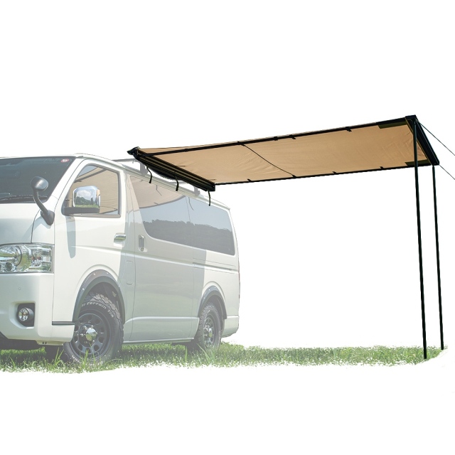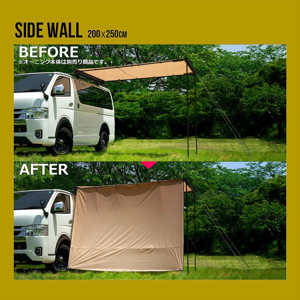 簡単組み立て、簡単収納のカーサイドオーニング ロールアップ 収納型 カーサイドオーニング/シェルター/アルコーブ/サイドウォールです。 [ 材質 ] 生地:420 Dオックスフォードポリエステル [ 使用サイズ ] オーニング:(約)幅200×奥行250× 高さ125-220 (cm) シェルター:(約)幅190×奥行240× 高さ215 (cm) アルコーブ:(約)幅145×奥行200×高さ200(cm) サイドウォール:(約)幅200×高さ250(cm) [ カラー ] サンド