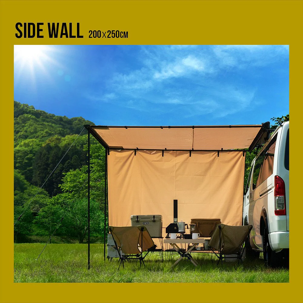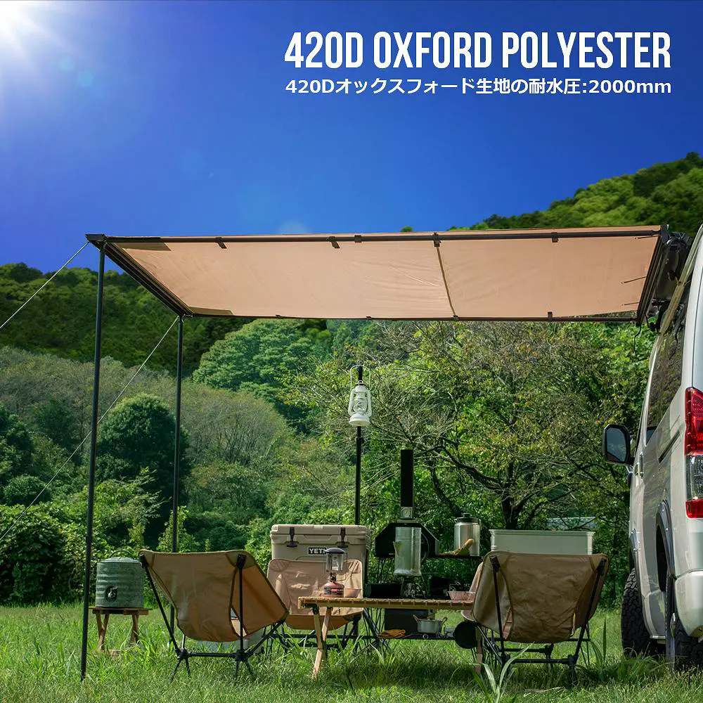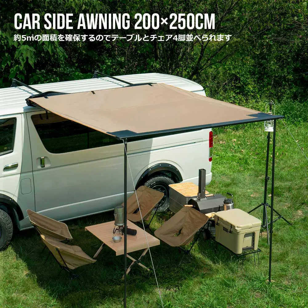 ロールアップ収納型カーサイドオーニングは、キャンプやアウトドア活動に最適な製品です。縦200cm、横250cmの広々とした空間を提供し、簡単に設営できるため、設営時間を大幅に短縮できます。サンドカラーのデザインは自然に溶け込み、耐水圧2000mmの素材が雨天時でも安心です。収納袋付きで持ち運びも便利。車に取り付けることで、日よけや災害時のシェルターとしても活用できます。オプションアイテムもシェルター、アルコーブ、サイドウォールと充実しています。セットでも単品でもご購入いただけます。