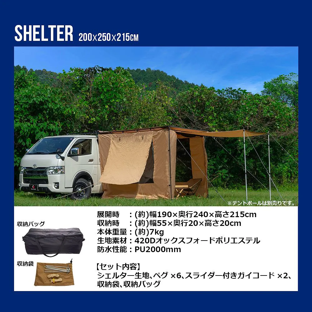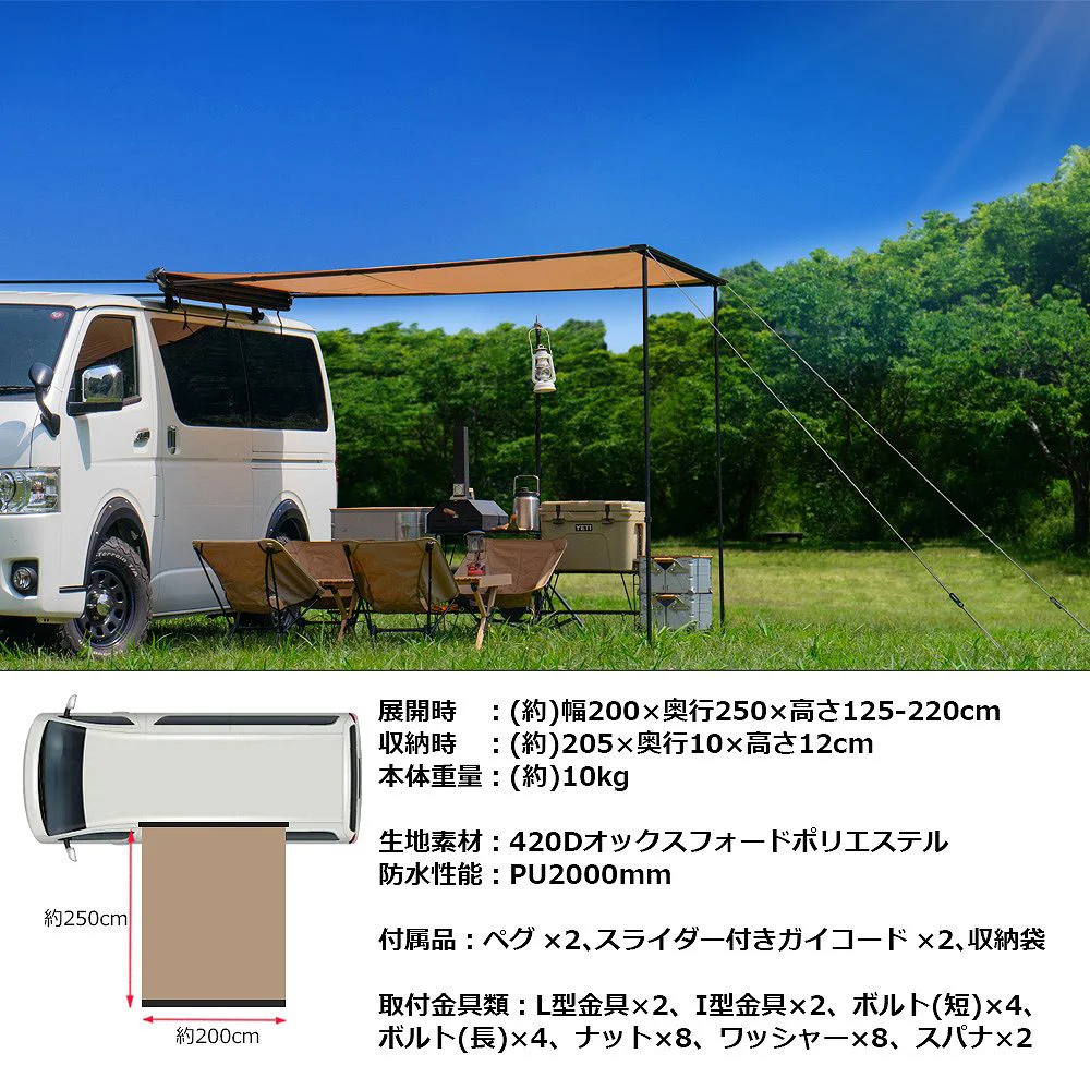 | 生地素材:420 Dオックスフォードポリエステル 展開時サイズ:(約)幅200×高さ250(cm) 重量:約800g 【付属品】ペグ×2、スライダー付きガイコード×2、収納袋、そのほか取付金具一式 |