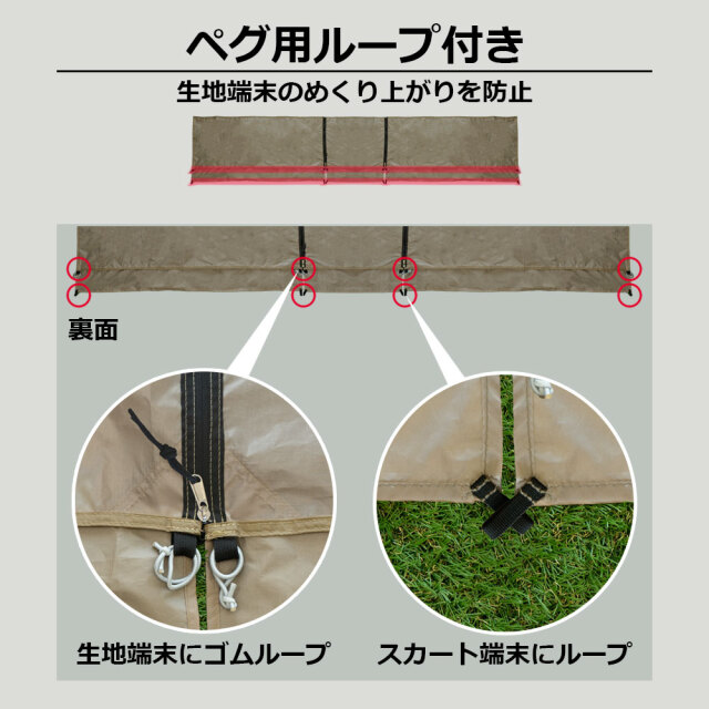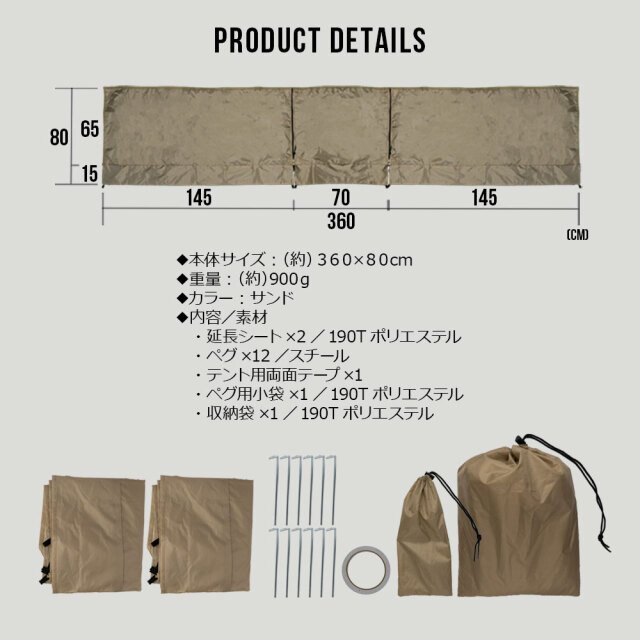 | ●延長シート 生地:190Tポリエステル ファスナー:ポリエステル、ナイロン、アルミ合金 ペグ用紐輪:ポリエステル ゴム輪:弾性ゴム ●ピンペグ:スチール ●テント用両面テープ:コットンペーパーとビスコース |