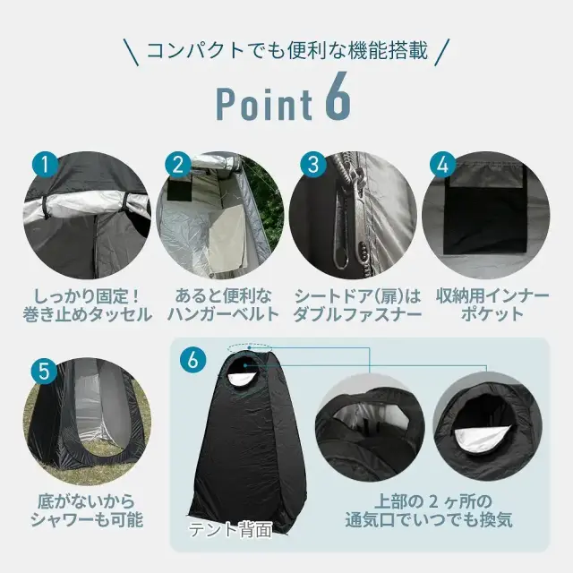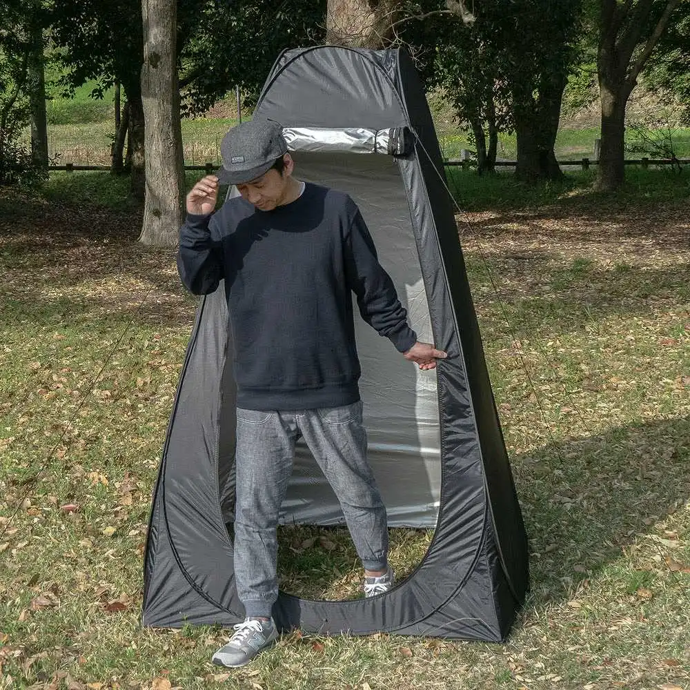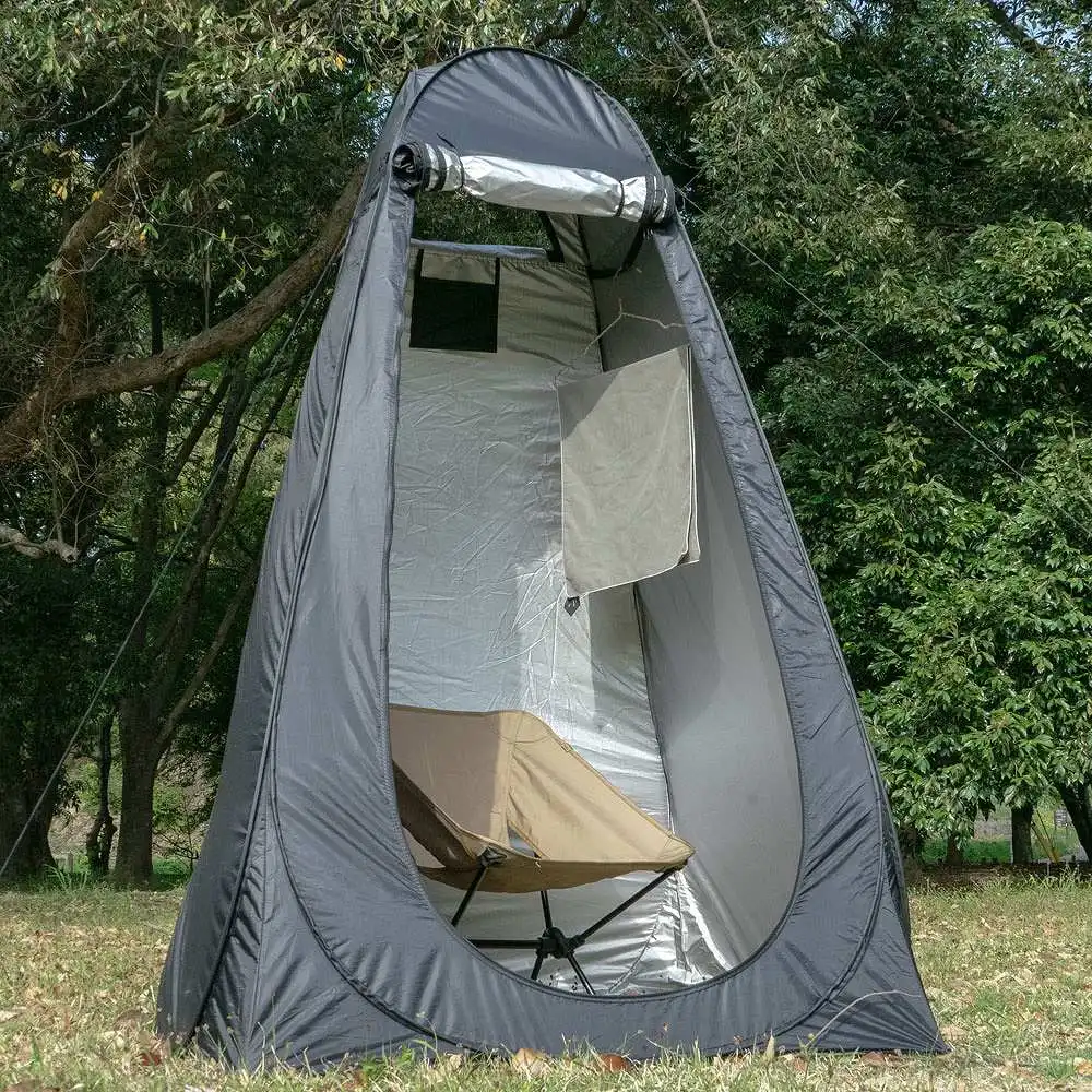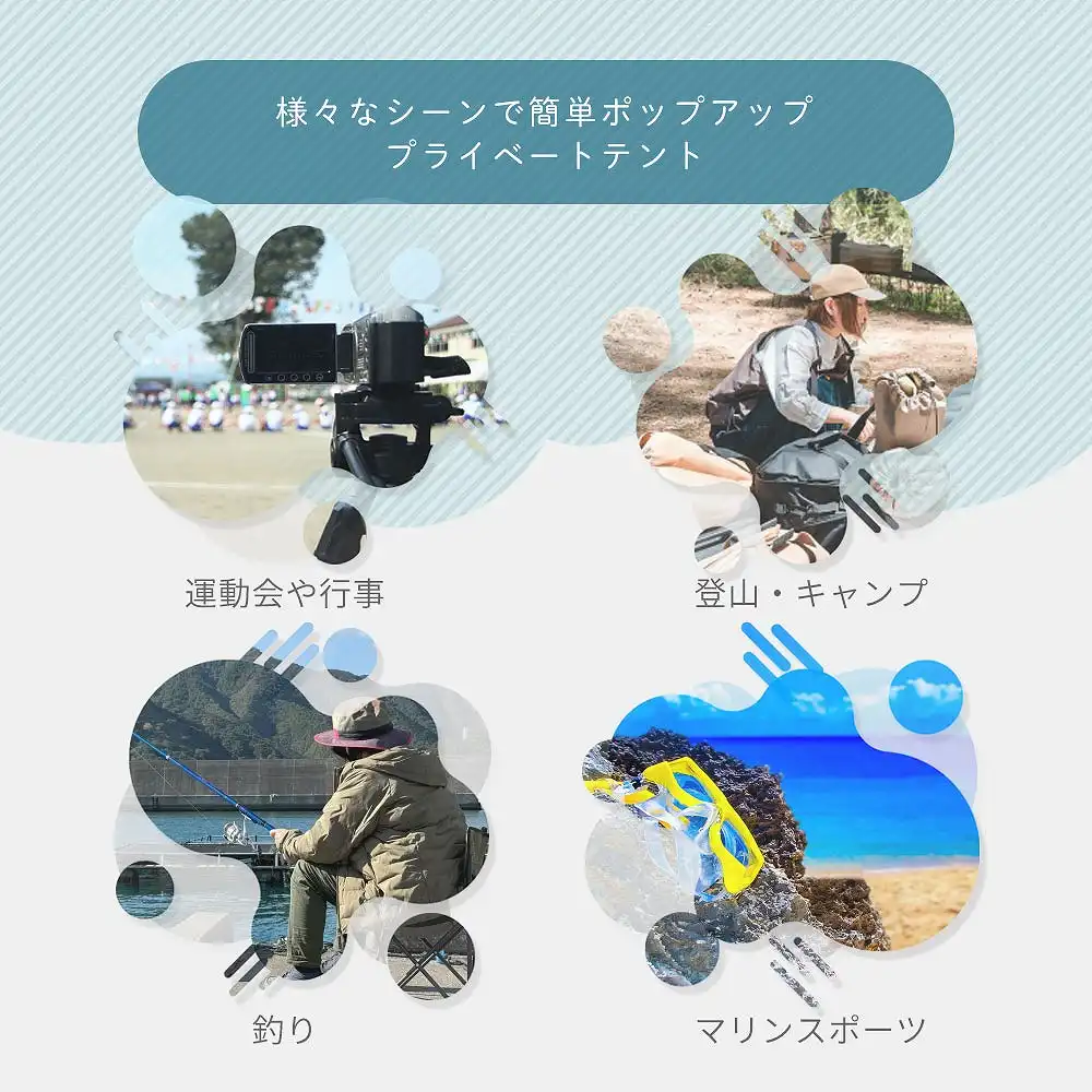 ポータブルプライベートテントは、アウトドアや災害時に最適な簡易テントです。ペグとロープが付属し、設置が簡単で、持ち運びも便利なリュックサック型です。換気機能があり、快適な空間を提供します。収納袋やフラップポケット、ハンガーストラップが付いており、着替えやプライベートスペースとして活用できます。海やビーチでの使用にも適しており、個室感を保ちながら安心して過ごせます。