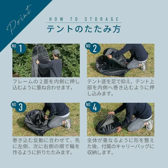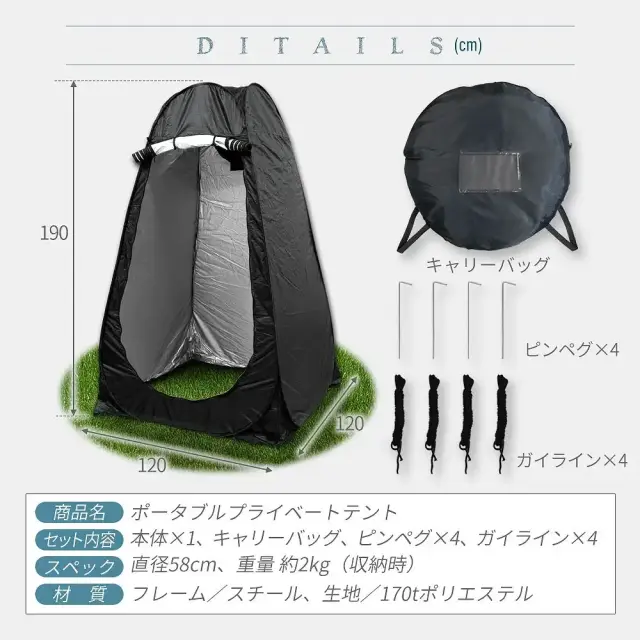 着替えや簡易トイレに最適 ポータブルプライベートテント ペグ ロープ付です。 [ 材質 ] 生地:ポリエステル、フレーム:スチール [ カラー ] ブラック [ サイズ ] 直径58cm(キャリーバッグ収納時) [ セット内容 ] テント本体、ガイラインx4、ピンペグx4 [ 組立方法 ] ポップアップ