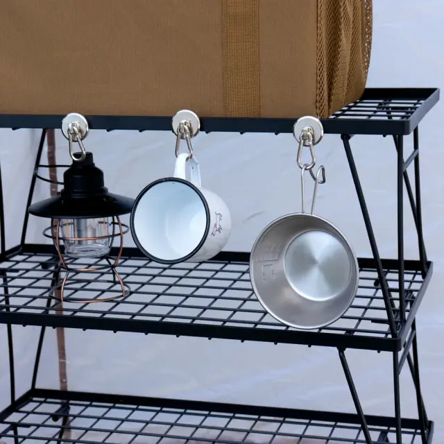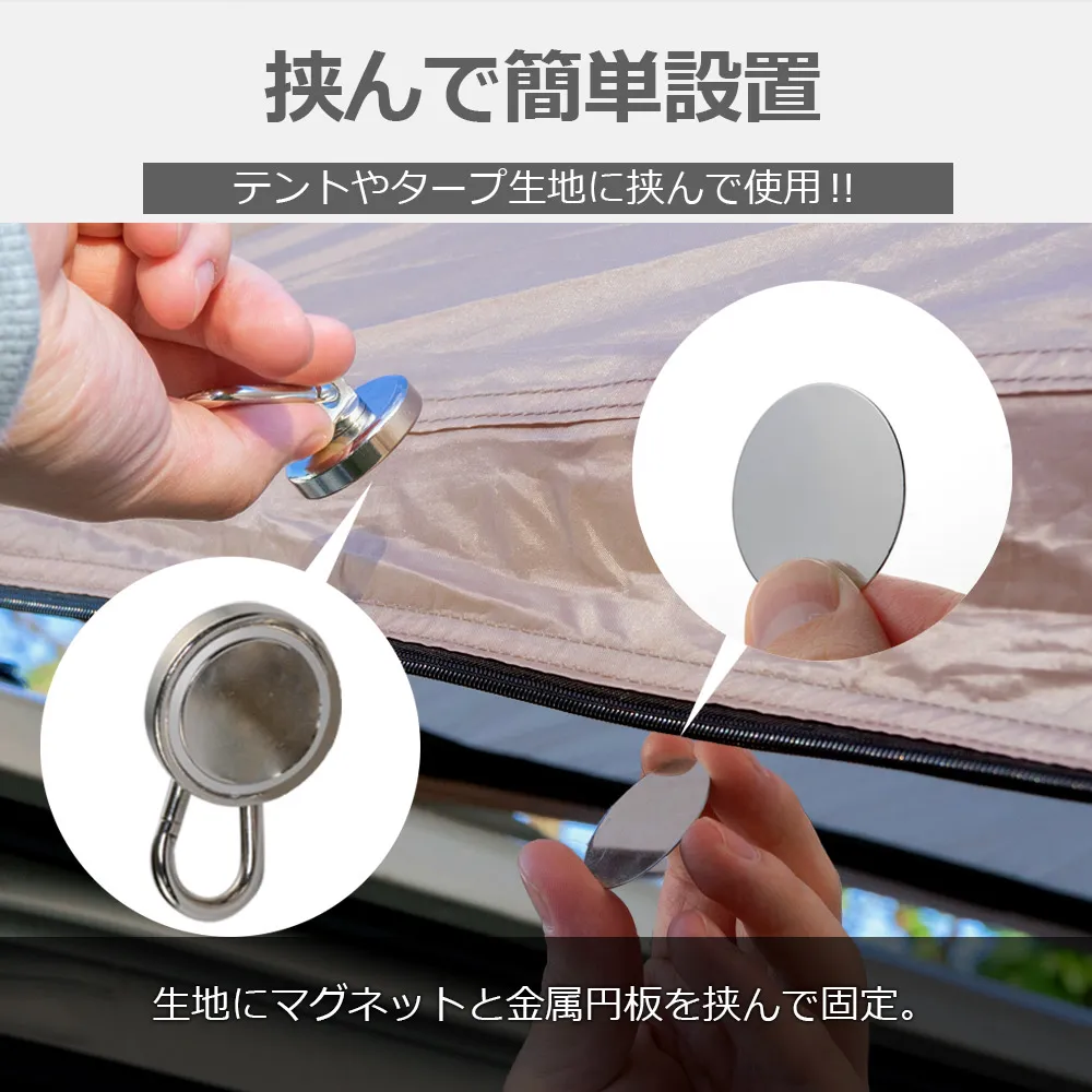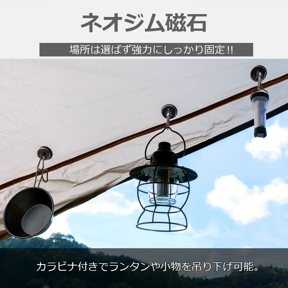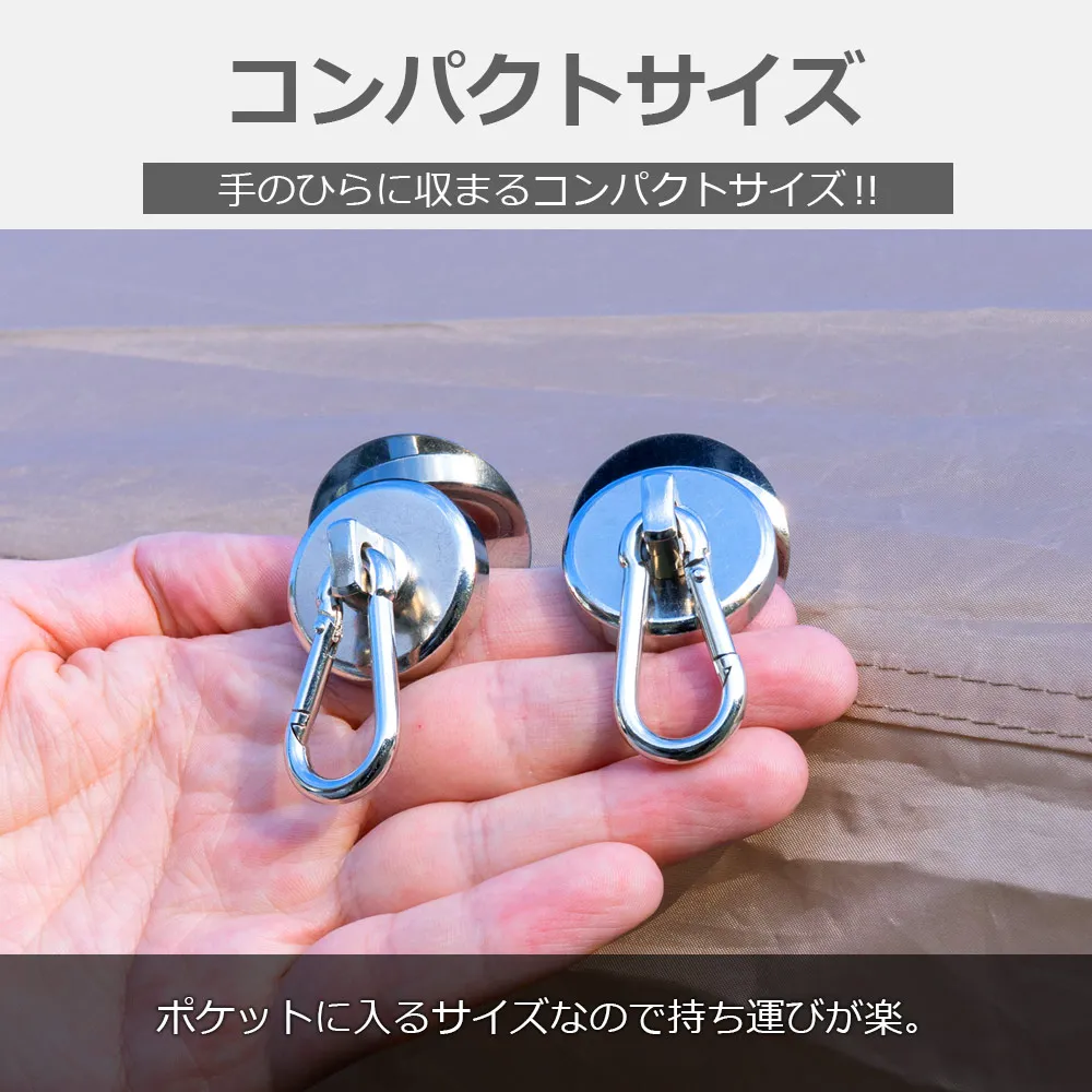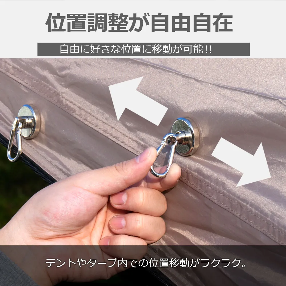 カラビナ付き強力マグネットフックは、アウトドアやキャンプでの使用に最適な製品です。耐荷重約42kgを誇るこのフックは、ネオジム磁石を使用しており、強力な磁力でしっかりと固定します。コンパクトで持ち運びやすく、金属プレートが付属しているため、様々な場所に簡単に取り付け可能です。キャンプ道具やサンシェードの設置に役立ち、浮かせる収納を実現します。テントやタープの設営時にも便利で、テントやタープ内での位置調整が自由自在にできます。