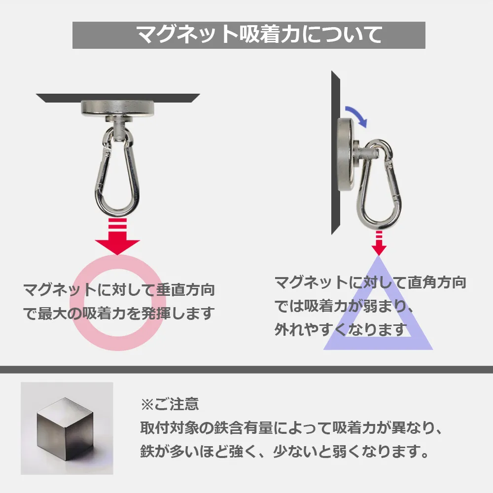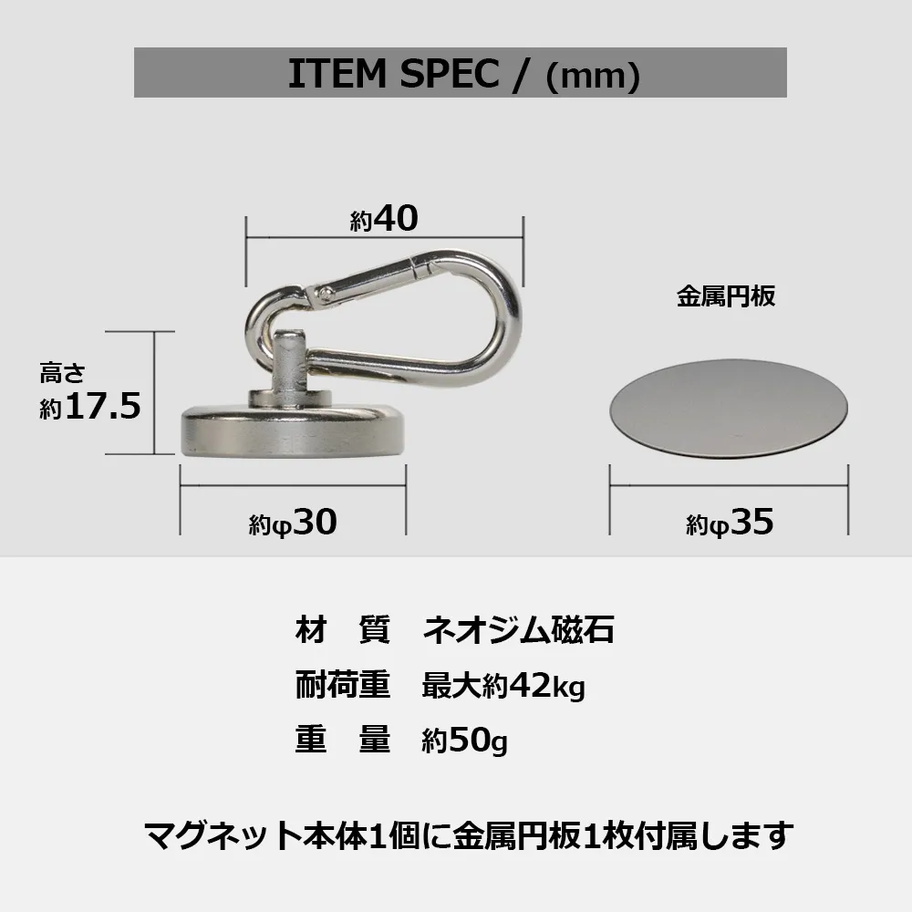 | 製品名: | カラビナ付き強力マグネットフック 貼り付け土台用金属プレート付き 耐荷重約42kg 直径約3cm 磁石 強力 アウトドア キャンプ タープ |