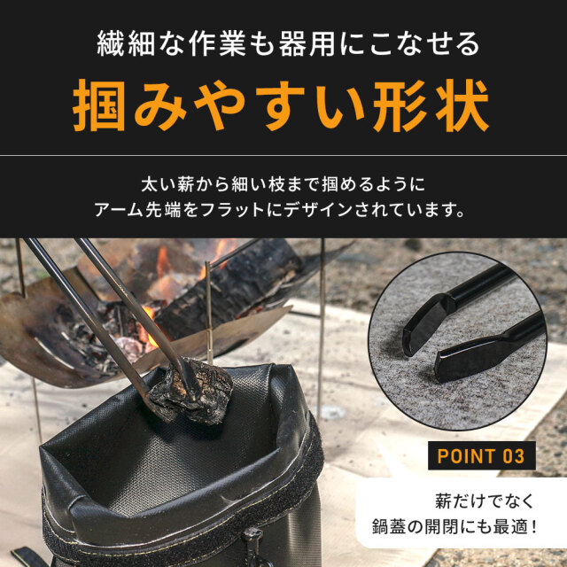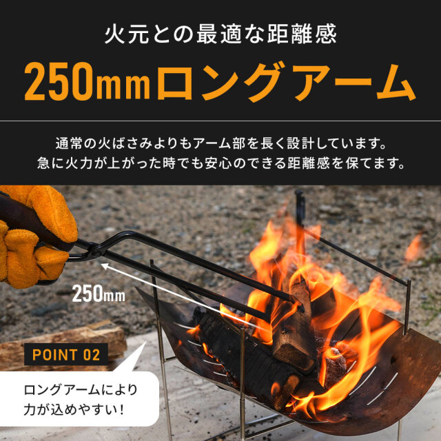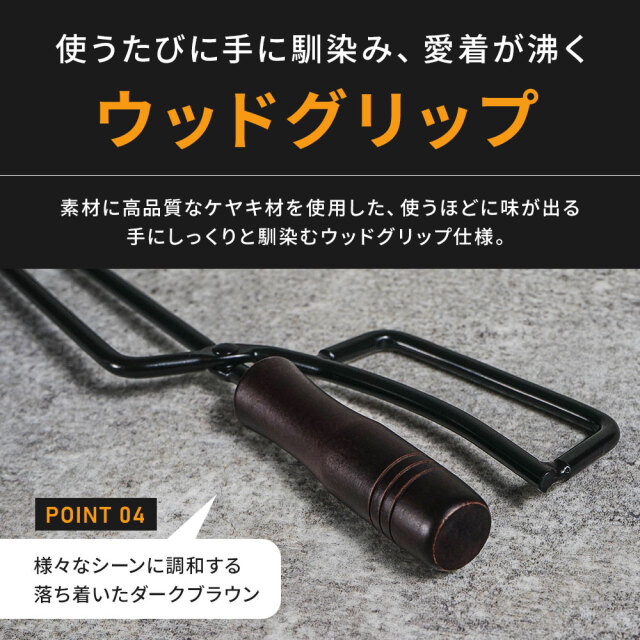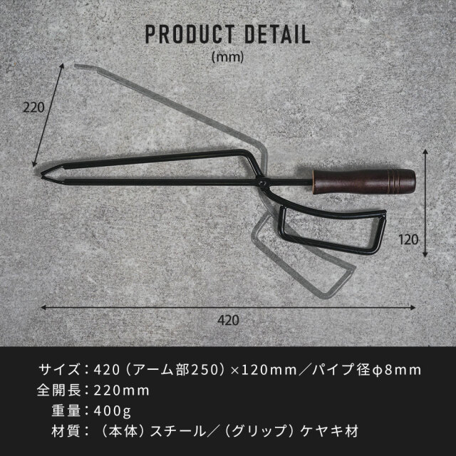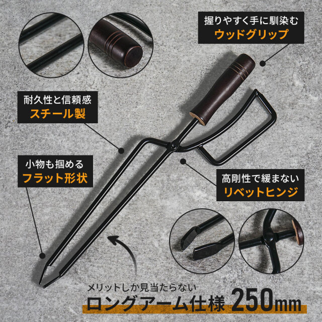 重い薪や高温の炭を安全に扱える火ばさみ。力を込めやすいロングアーム仕様 [ 材質 ] 本体:スチール、グリップ:ケヤキ材 [ セット内容 ] 本体1p+取扱説明書 [ 装着方法 ] 全長:420(アーム部:250)×幅:120mm/パイプ径:φ8mm ■特徴 力を込めやすい250mmロングアーム仕様