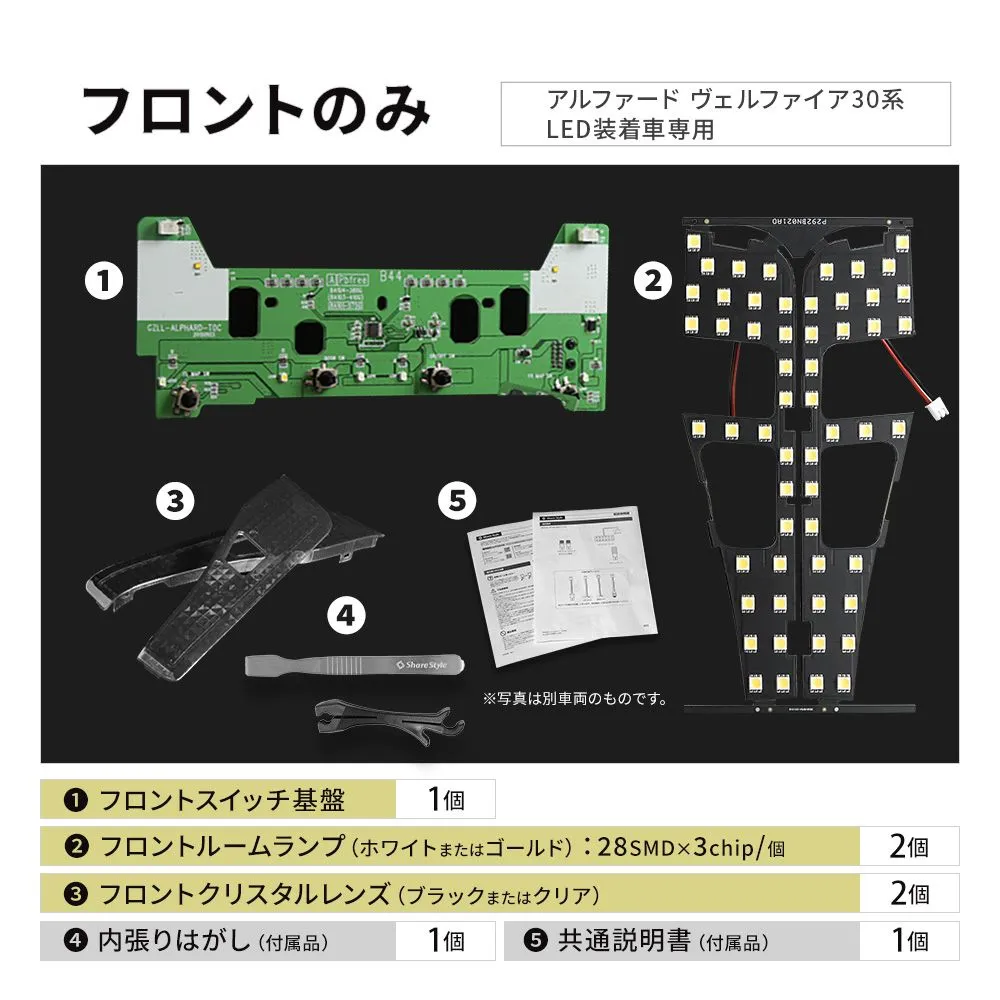 フロントのみ ■フロントルームランプ(ホワイト/ゴールド) ■フロント専用クリスタルレンズ(ブラック/クリア) ■基盤(フロント) ■説明書・内張りはがし リアのみ ■リアサイドルームランプ(ホワイト/ゴールド) ■リアサイド専用クリスタルレンズ(ブラック/クリア) ■基盤(リアサイド) ■説明書 フルセット ■フロントルームランプ(ホワイト/ゴールド) ■リアサイドルームランプ(ホワイト/ゴールド) ■基盤(フロント・リアサイド) ■フロント専用クリスタルレンズ(ブラック/クリア) ■リアサイド専用クリスタルレンズ(ブラック/クリア) ■説明書・内張りはがし |