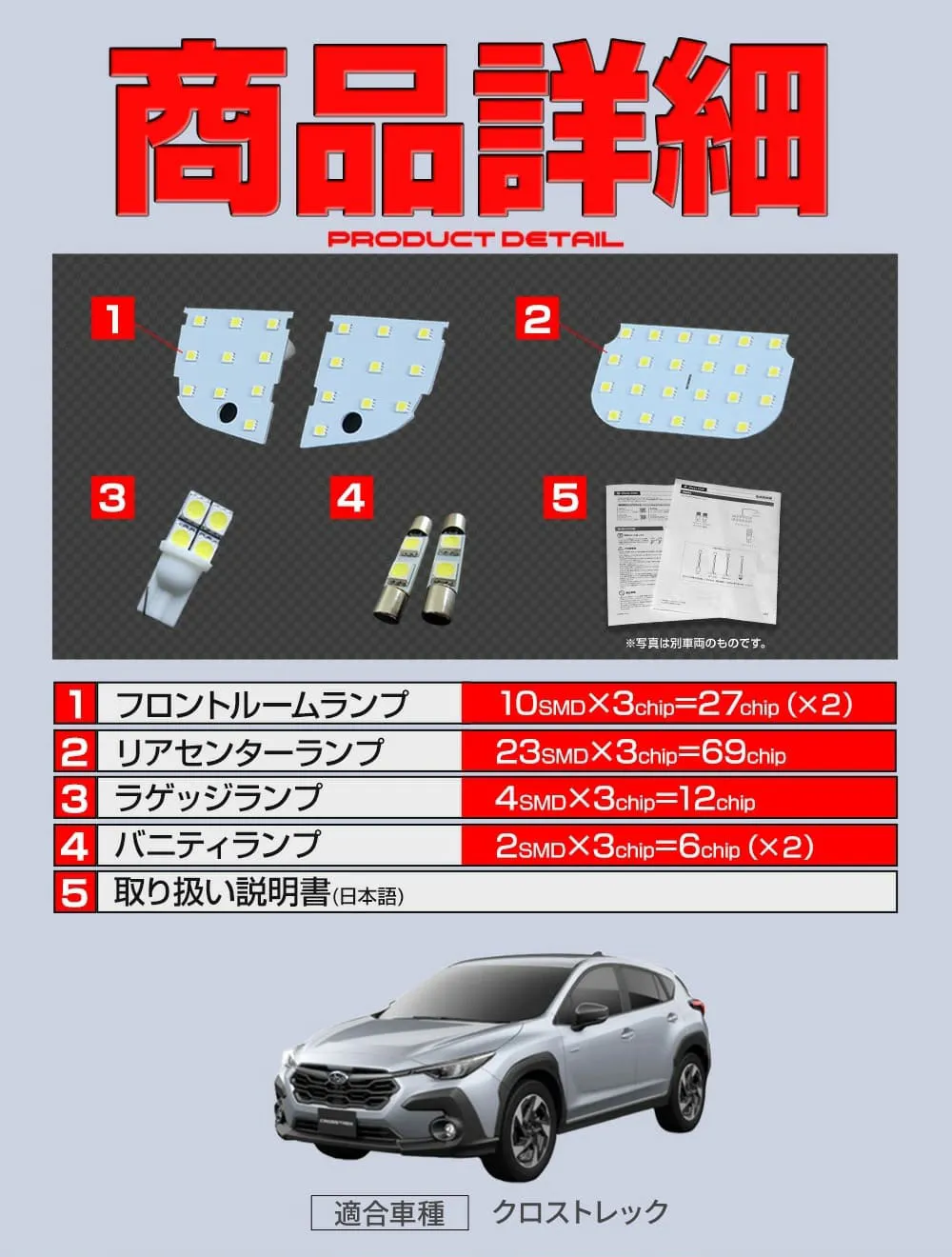 純正を遥かに凌ぐ明るさと高級感あふれる美光  クロストレック GUD GUE ツーリング リミテッド LED ルームランプ セットです。   [ 材質 ] LED [ カラー ] シャンデリアホワイト [ セット内容 ] フロントルームランプ×1 + リアセンターランプ×1 + ラゲッジランプ×1 + バニティランプ×2 + 取扱説明書 [ 装着方法 ] 純正交換   ■適合車種 クロストレック R4.12~ GUD,GUE グレード:ツーリング/リミテッド(両対応)
