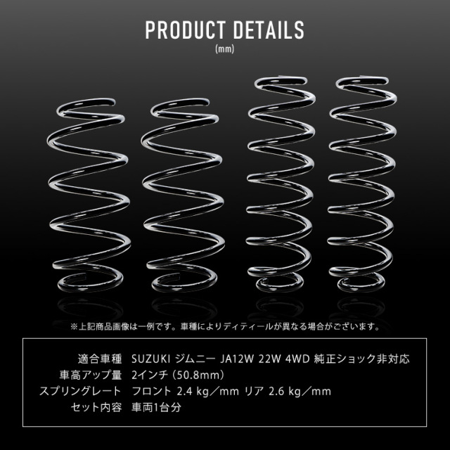 リフトアップでアクティブな車両にカスタマイズできるリフトアップスプリングです。 [ 材質 ]SUP9/SAE9254 [ 車高アップ量 ] 2インチ(50.8mm) [ スプリングレート ]フロント 2.4 kg/mm リア 2.6 kg/mm [ 適合車種 ]ジムニー JA12W 22W 4WD 純正ショック非対応
