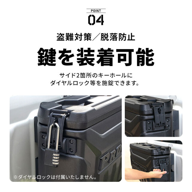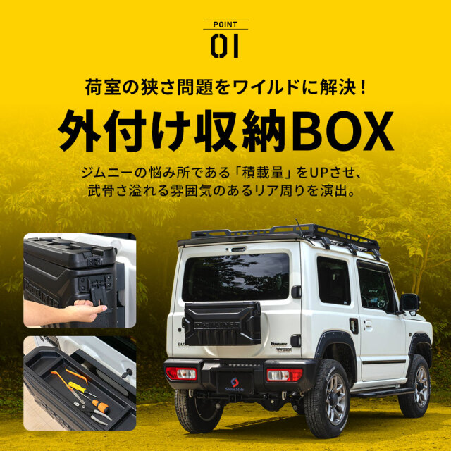 ジムニー、ジムニーシエラ、ジムニーノマドのために設計された外付け収納ボックスは、積載量の問題を解決し、アウトドアやキャンプでの利便性を向上させます。このツールボックスは、スペアタイヤを外して取り付けることで、車両の外観を損なうことなく、工具や小物を整理整頓できます。耐久性に優れた素材を使用し、武骨なデザインが車両のリア周りに力強い印象を与えます。ジムニーの魅力をさらに引き立てるアクセサリーです。