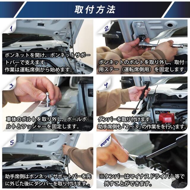 穴あけ等の加工不要!ボルトオンでお手軽にメンテナンス性&ドレスアップ効果大幅UP! ジムニー ジムニーシエラ ジムニーノマド JB64 JB74 JC74 専用 ボンネットダンパー 一式です。 [ 材質 ] 鉄 [ カラー ] ブラック [ セット内容 ] 一式+取扱説明書 [ 装着方法 ] ボルトオンで取付 ■適合車種 ジムニー ジムニーシエラ ジムニーノマド JB64 JB74 JC74 H30.7~