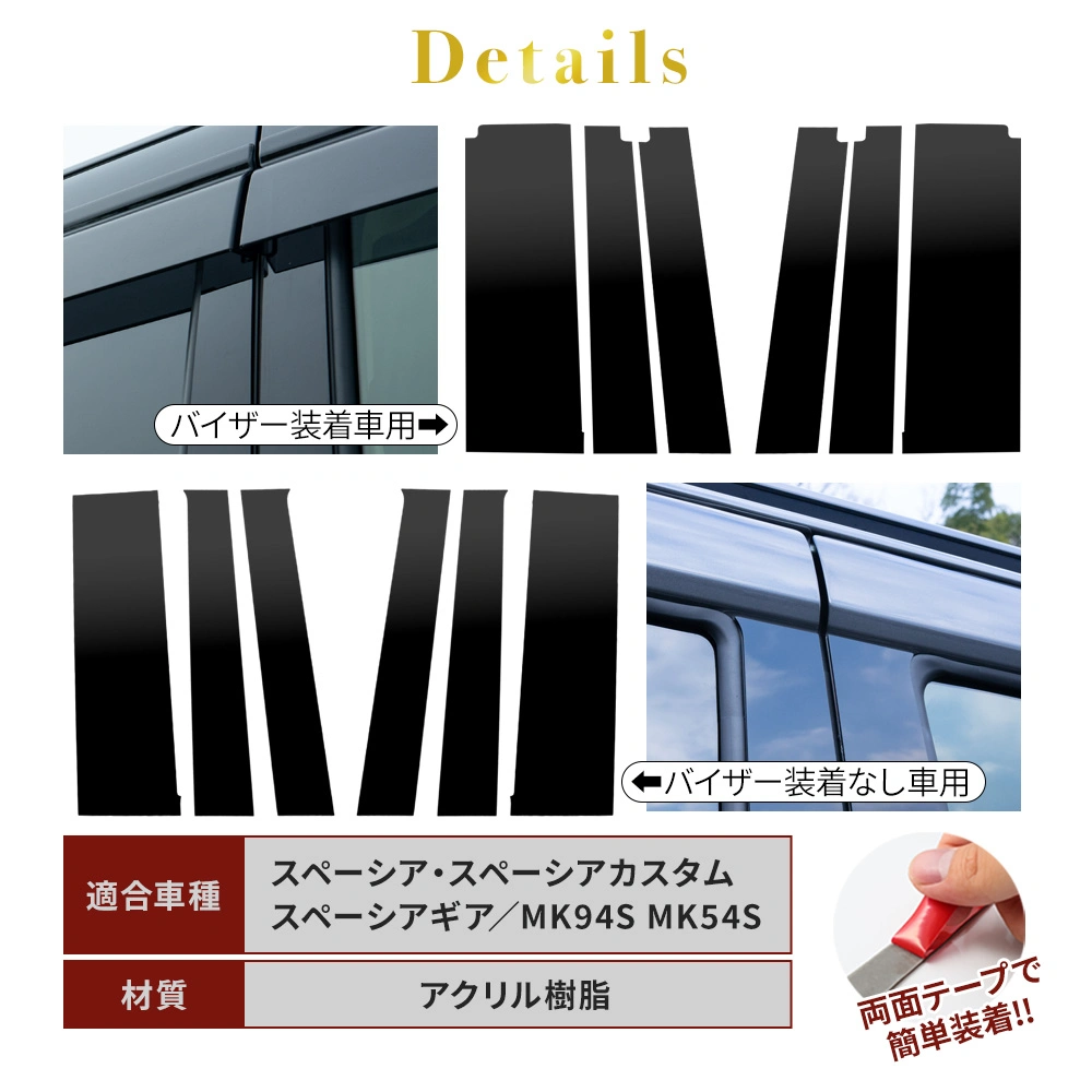 簡単取り付けで愛車をさりげなくドレスアップ!スペーシア スペーシアカスタム スペーシアギア MK94S MK54S ピラーカバー 6p [ 材質 ] アクリル樹脂 [ カラー ] ブラック [ セット内容 ] 6p+マスキングテープ+粘着促進剤 [ 装着方法 ] 裏面強力両面テープで貼り付け ■適合車種 スペーシア スペーシアカスタム MK94S MK54S R5.11~ スペーシアギア MK94S MK54S R6.9~