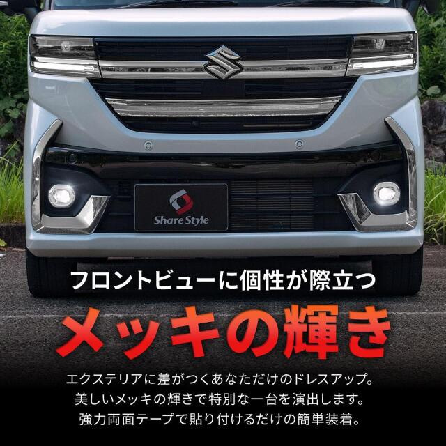 お手軽カスタム!高級感をプラス! スペーシアカスタム MK94S MK54S フォグランプ用アイライン 2P です。 [ 材質 ] ABS樹脂 [ カラー ] シルバー [ セット内容 ] 2p+粘着促進剤 [ 装着方法 ] 裏面両面テープで簡単取付 ■適合車種 スペーシアカスタム MK94S MK54S R5.11~